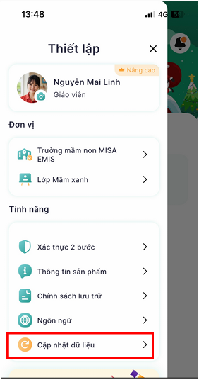 - Trong Thiết lập, chọn Cập nhật dữ liệu.