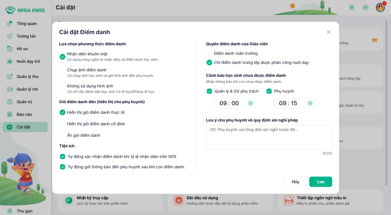 • Lưu ý cho phụ huynh: Nhập nội dung quy định hoặc lưu ý về việc xin nghỉ phép để hiển thị trên ứng dụng của phụ huynh.