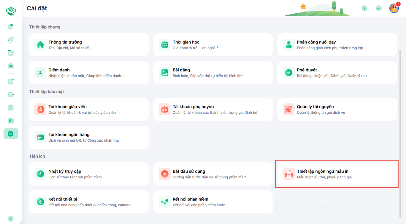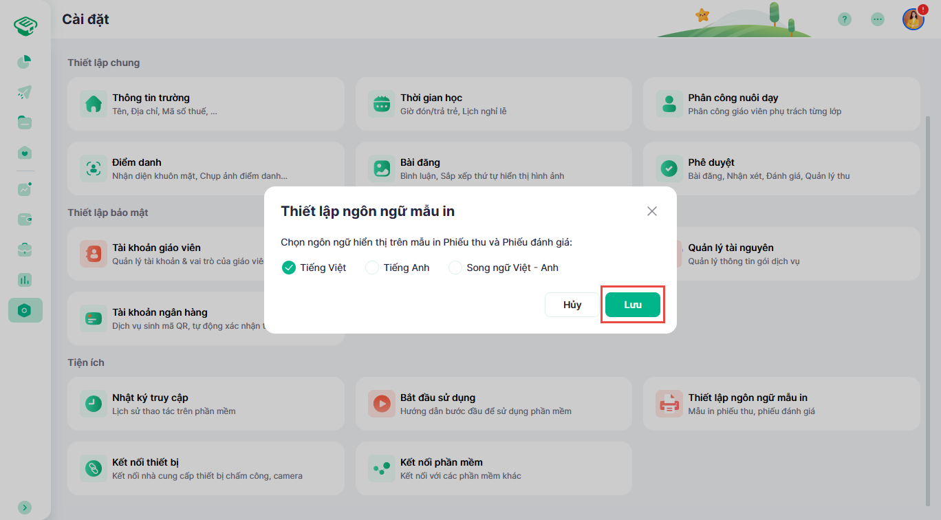 Mục đích: Giúp nhà trường chủ động tùy chỉnh và lựa chọn ngôn ngữ hiển thị trên các mẫu in như phiếu thu, phiếu đánh giá, đảm bảo các tài liệu này chuyên nghiệp và phù hợp với nhu cầu sử dụng.