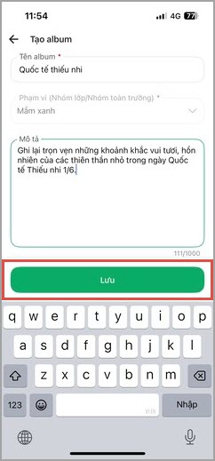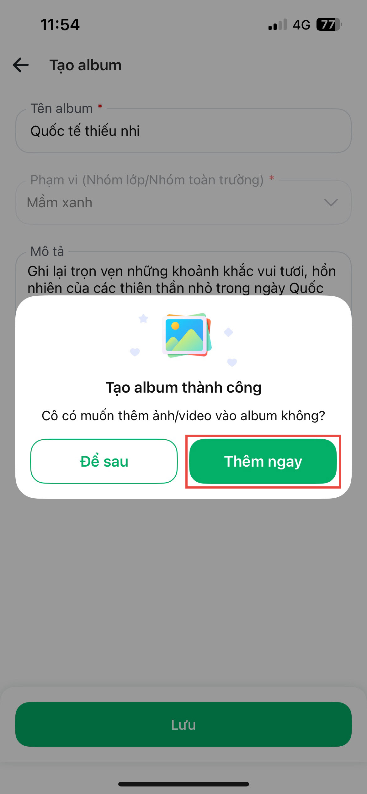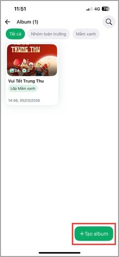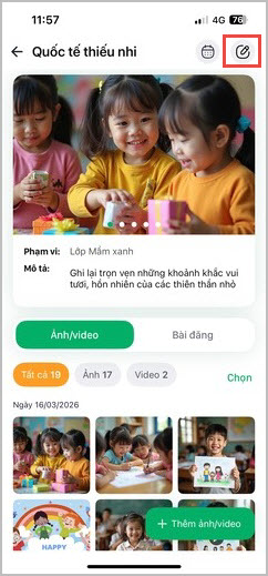 Mục đích: Giúp giáo viên lưu trữ và sắp xếp hình ảnh, video của học sinh theo từng sự kiện một cách khoa học. Mỗi album sau khi tạo sẽ tự động xuất hiện trên Bảng tin, giúp phụ huynh dễ dàng theo dõi và tương tác.