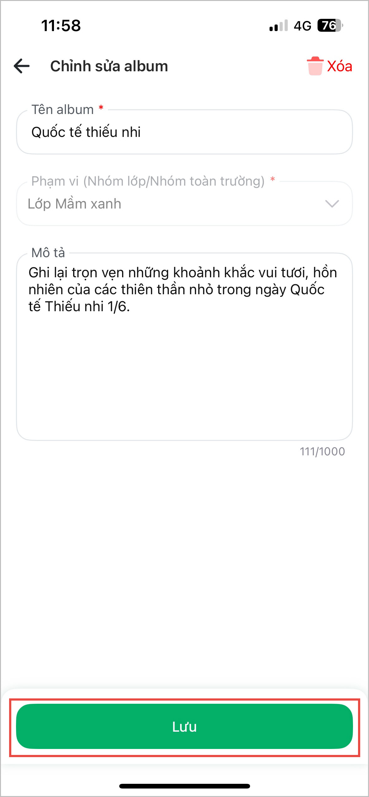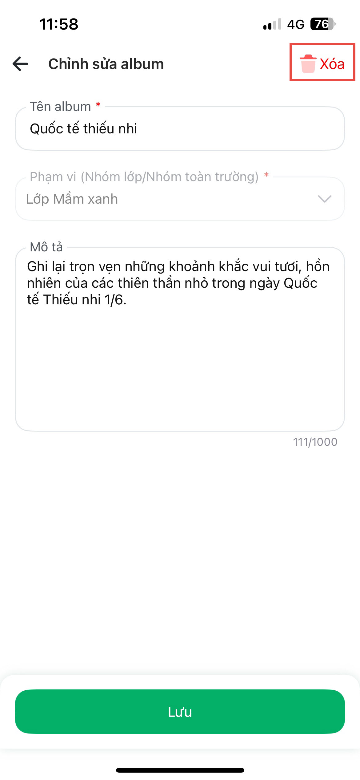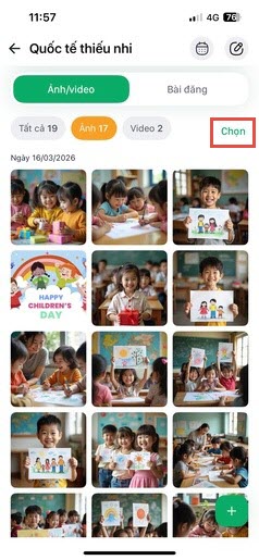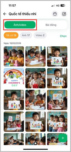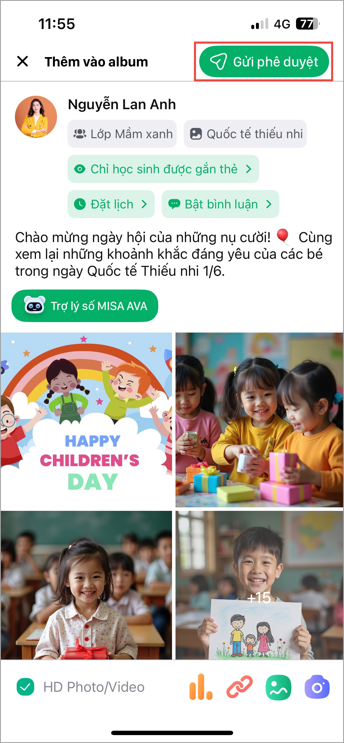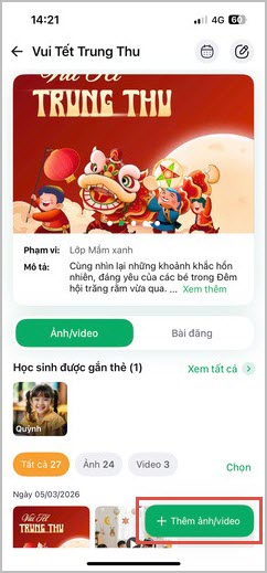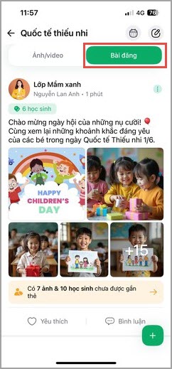 - Hiển thị tự động: Mỗi album sau khi tạo sẽ tự động hiển thị như một bài đăng trên Bảng tin của lớp. Phụ huynh có thể xem, yêu thích và bình luận trực tiếp.