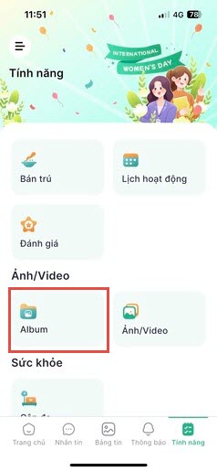 - Truy cập vào Tính năng → Album (trong phần Ảnh/Video).