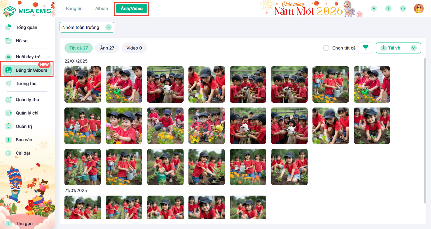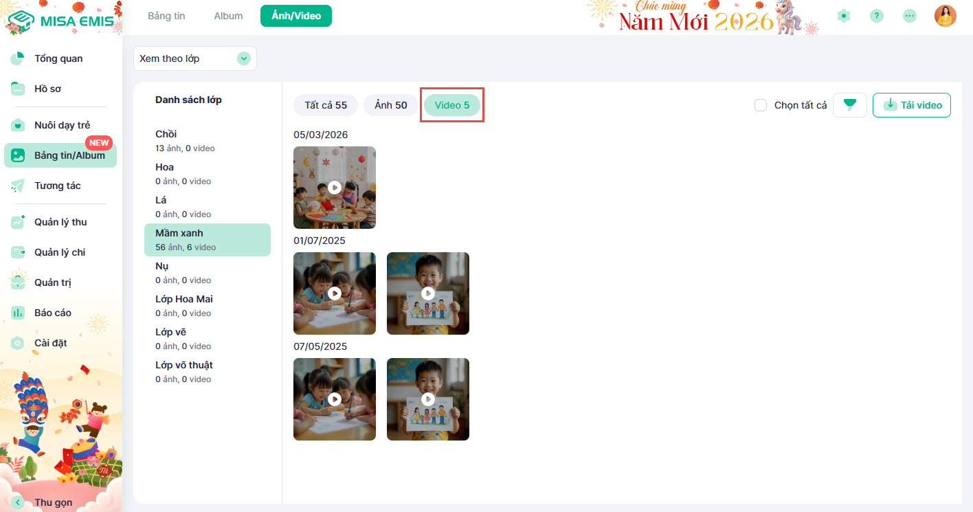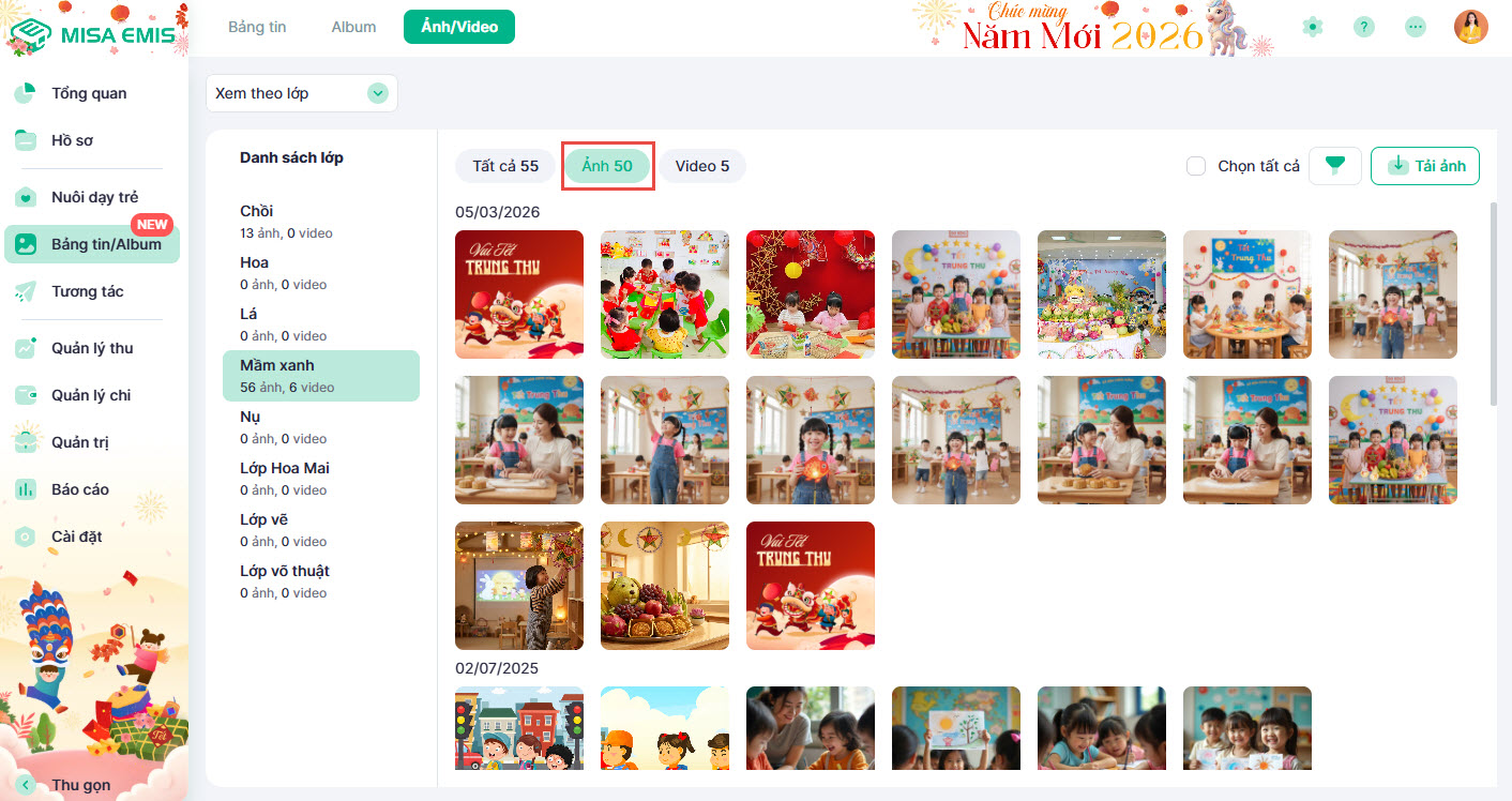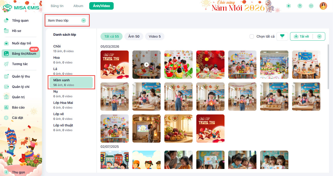3. Hệ thống sẽ hiển thị toàn bộ ảnh, video của lớp đã chọn. Anh/Chị có thể tiếp tục lọc riêng theo Ảnh hoặc Video.