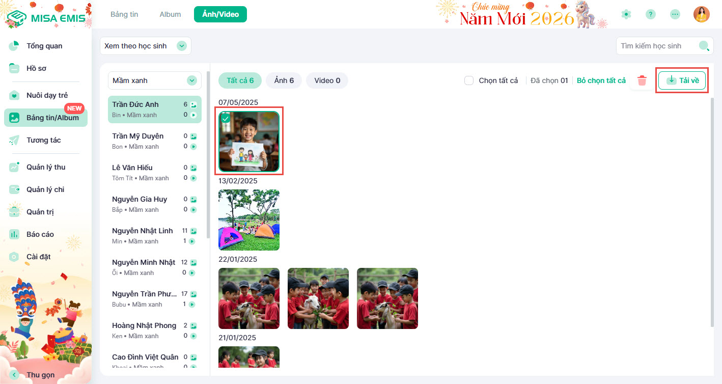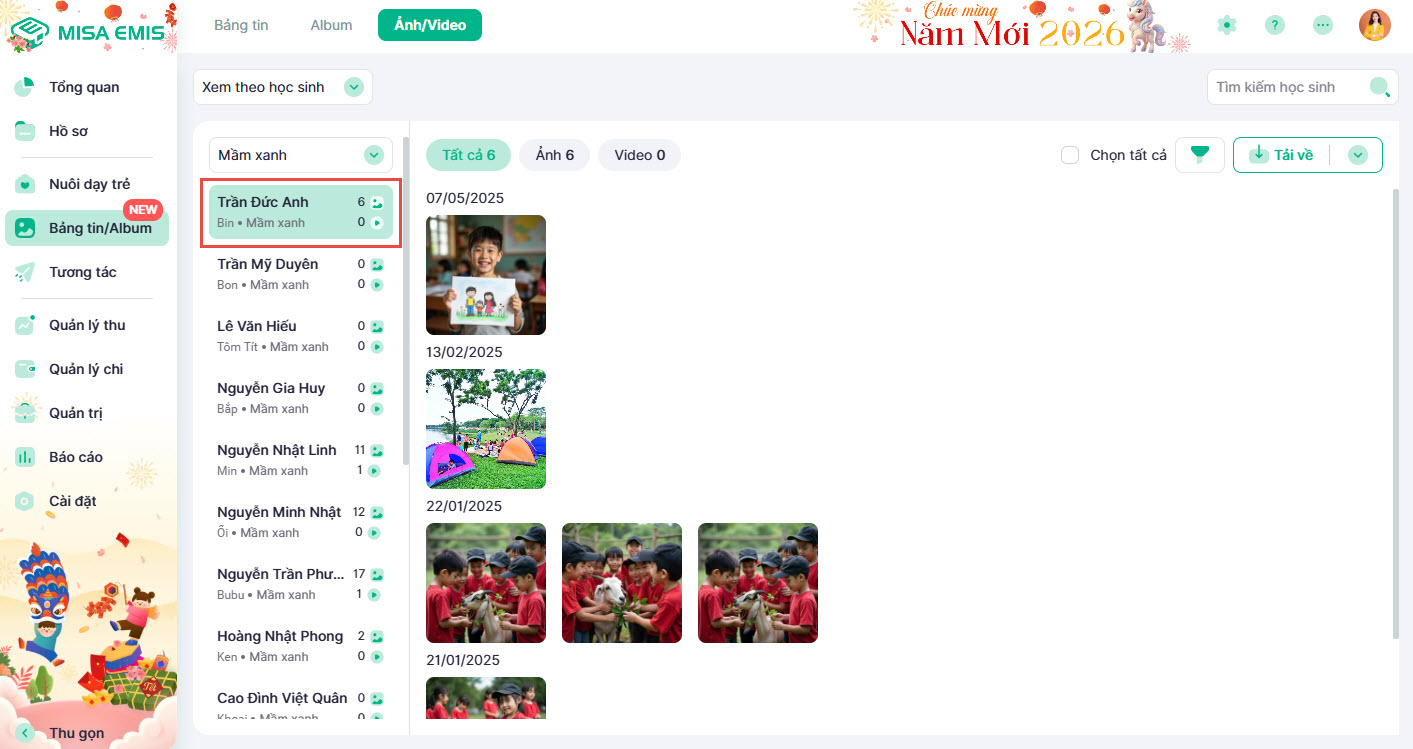 3. Chọn tên học sinh cụ thể từ danh sách để xem tất cả hình ảnh, video mà bé đã được gắn thẻ.
