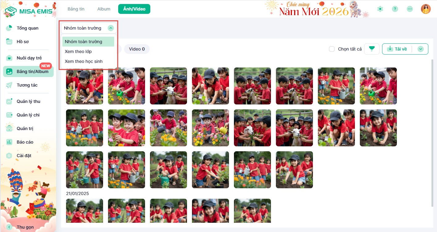 • Chọn Nhóm toàn trường. Màn hình hiển thị toàn bộ ảnh và video của tất cả các lớp.