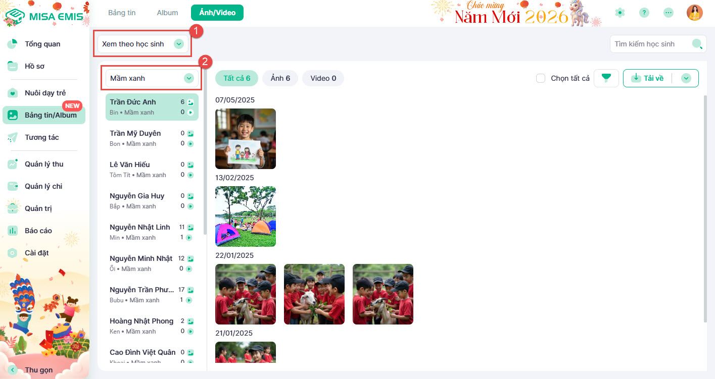 • Hướng dẫn xem và lọc, tìm kiếm ảnh/video: theo toàn trường, theo lớp, theo học sinh