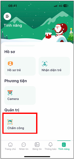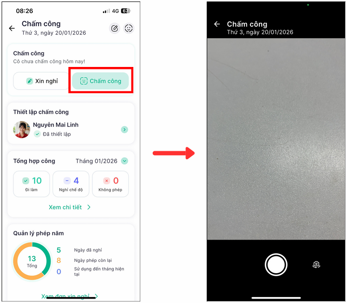 - Tại màn hình chính, nhấn nút Chấm công để ghi nhận thời gian làm việc.
