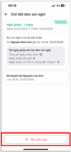 - Với đơn “Đã duyệt”, Anh/Chị có thể Yêu cầu hủy nếu có thay đổi.
