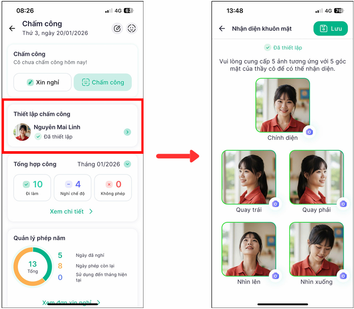 - Cài đặt nhận diện khuôn mặt để chấm công (thực hiện lần đầu).