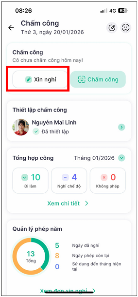 - Tại màn hình Chấm công, nhấn nút Xin nghỉ.