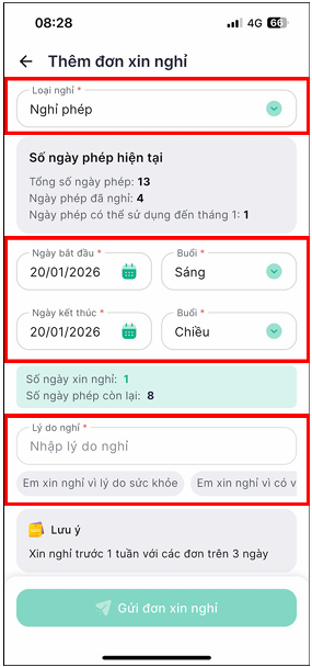 - Chọn loại nghỉ: Nghỉ phép, nghỉ không phép, nghỉ chế độ (kết hôn, thai sản,…).