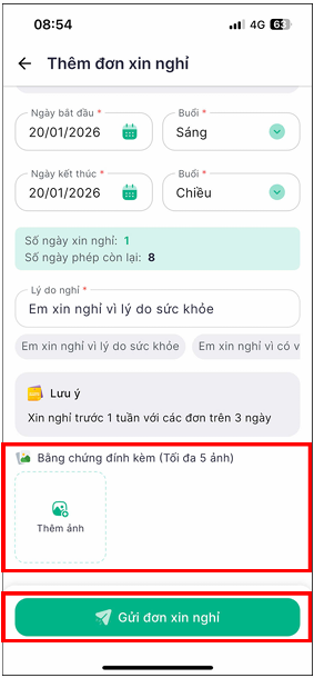 - Nhập lý do và đính kèm ảnh minh chứng (nếu có).