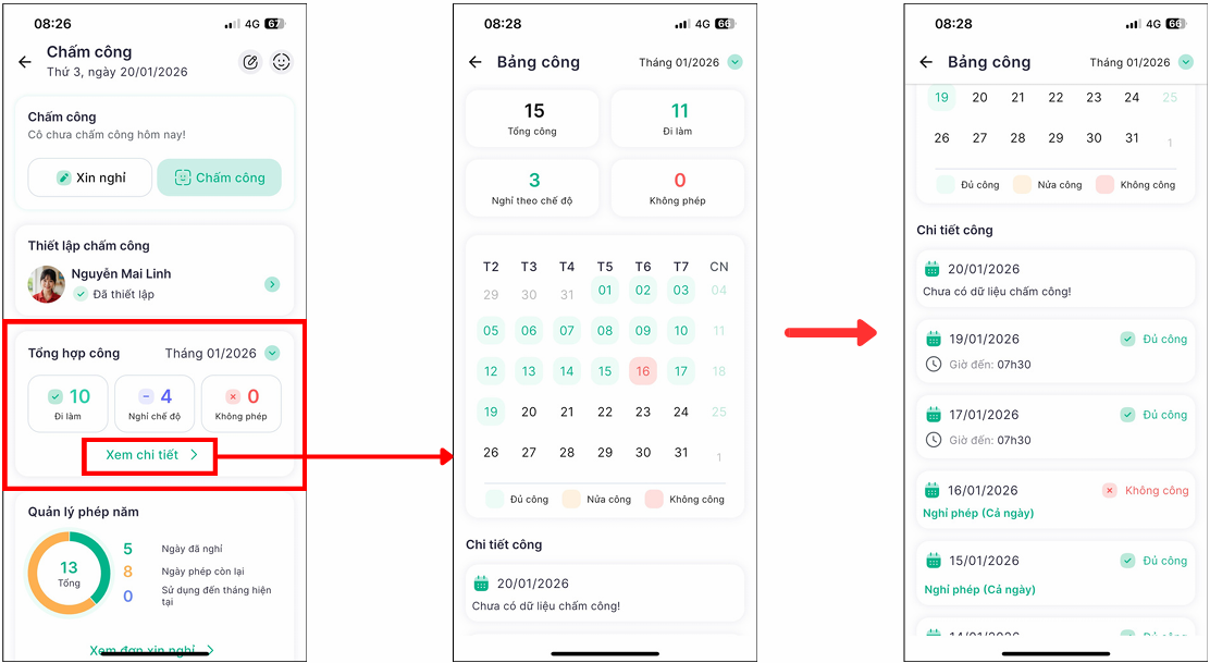 Mục tiêu: Giúp Anh/Chị nắm bắt tổng quan số ngày công trong tháng và quản lý số ngày phép năm còn lại của mình.