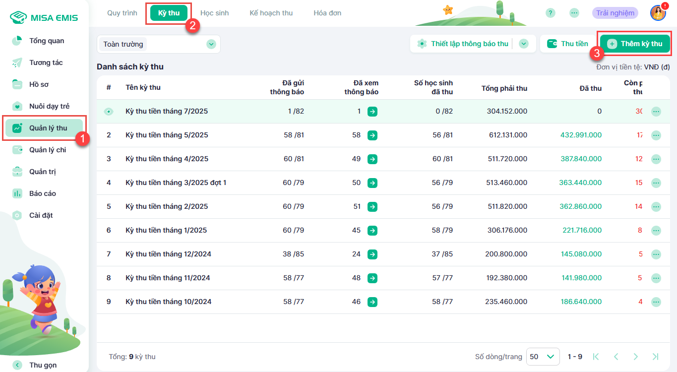 Mục đích: Giúp Kế toán nhà trường tạo một kỳ thu chi tiết, làm cơ sở để rà soát, chốt số liệu và gửi thông báo thu phí đến phụ huynh một cách chính xác và chuyên nghiệp.