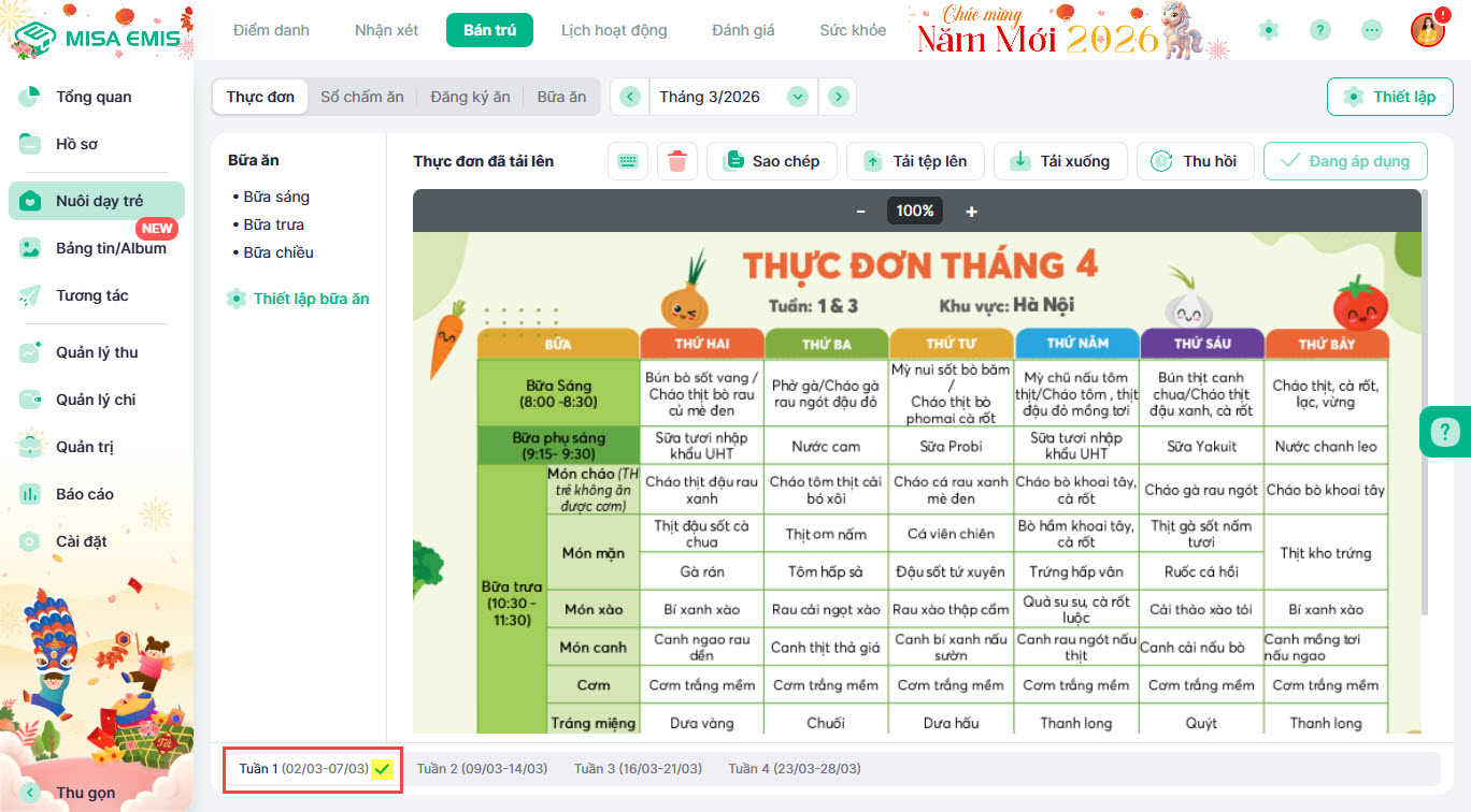 Mục đích: Tính năng Thực đơn được thiết kế để giúp Anh/Chị dễ dàng thiết lập, quản lý và công khai thực đơn hàng tuần cho học sinh. Anh/Chị có thể tạo một thực đơn chung cho toàn trường hoặc thiết lập các thực đơn riêng biệt cho từng khối/lớp một cách linh hoạt và nhanh chóng.