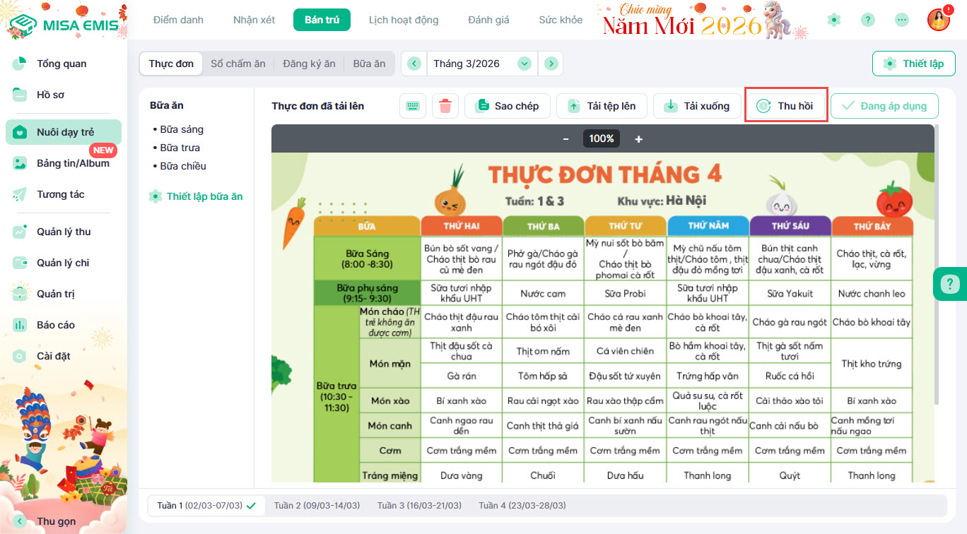 • Sau khi thu hồi: Tuần đó sẽ không còn hiệu lực, dấu tích sẽ biến mất. Anh/Chị có thể chỉnh sửa hoặc áp dụng một thực đơn mới.