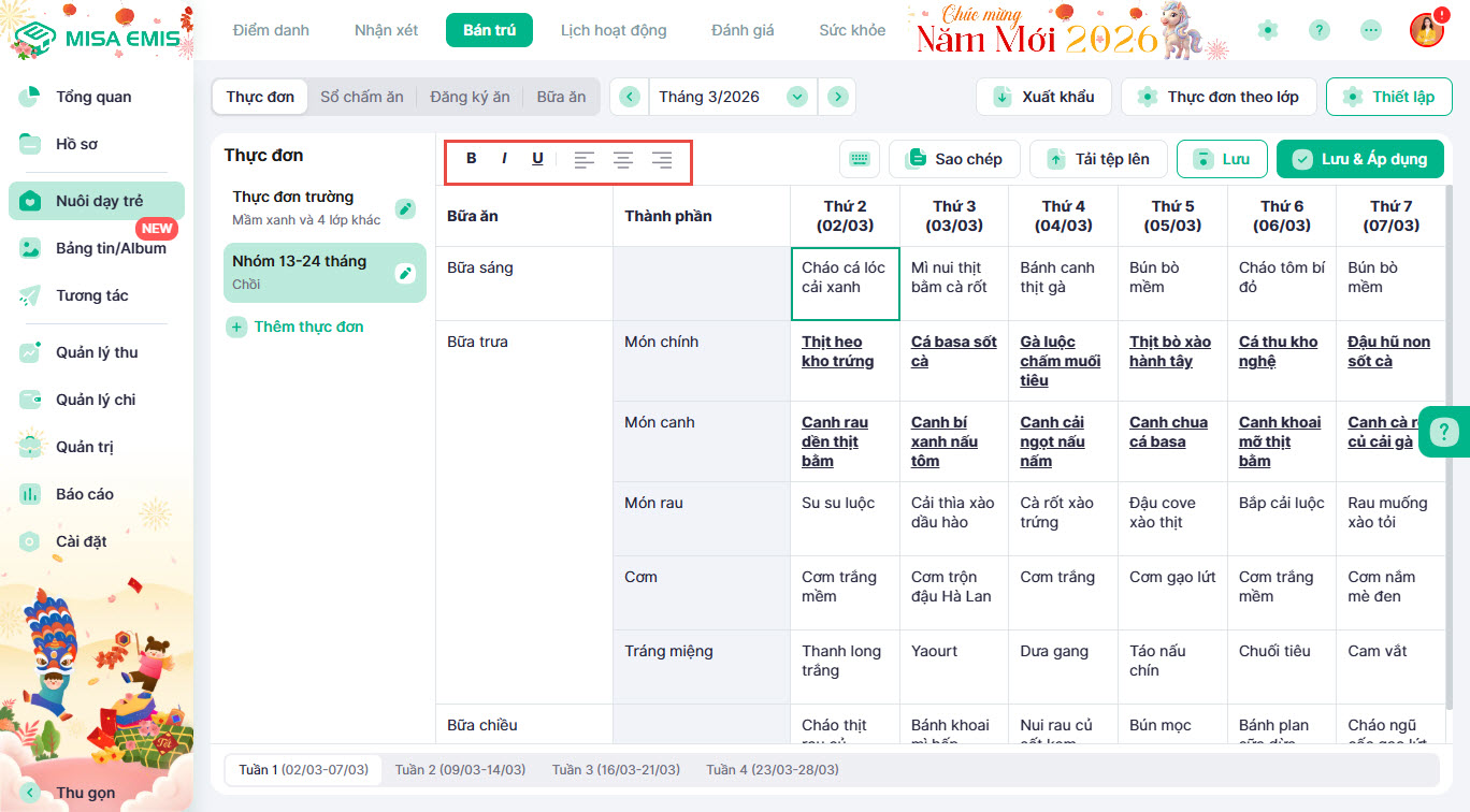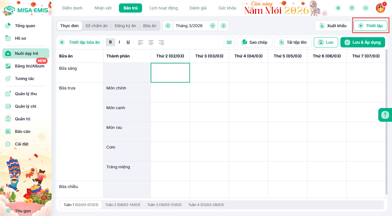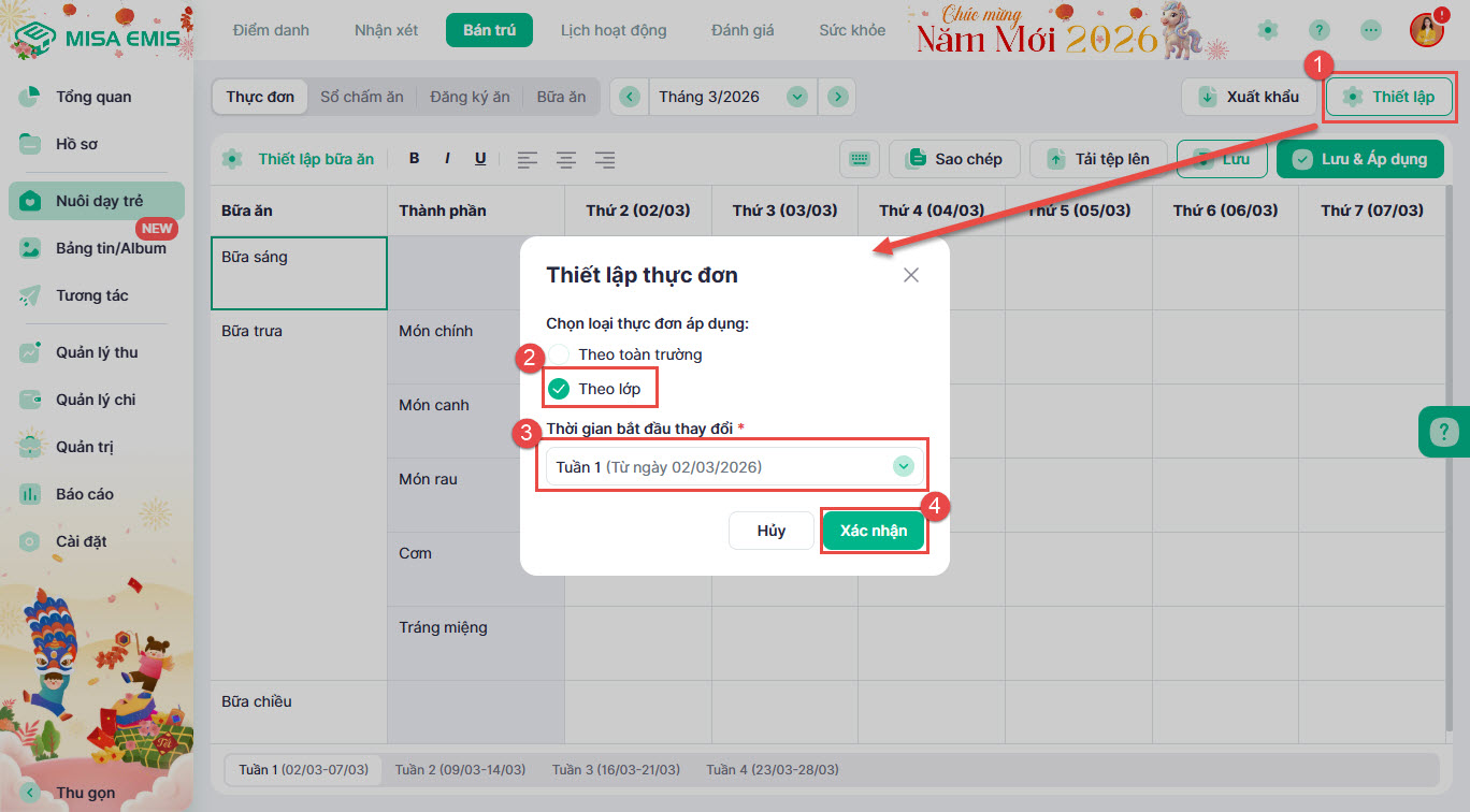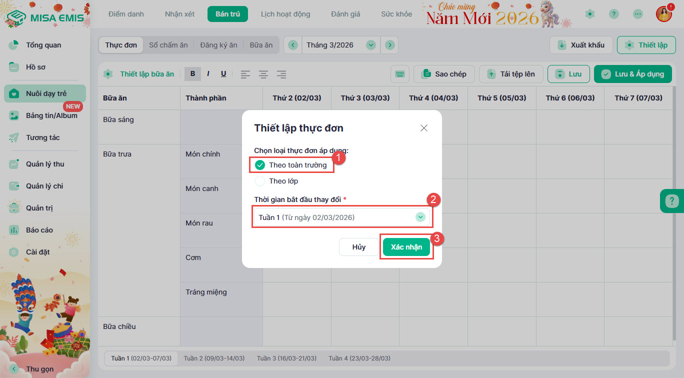• Theo toàn trường: Tạo một thực đơn duy nhất, áp dụng cho tất cả các lớp.