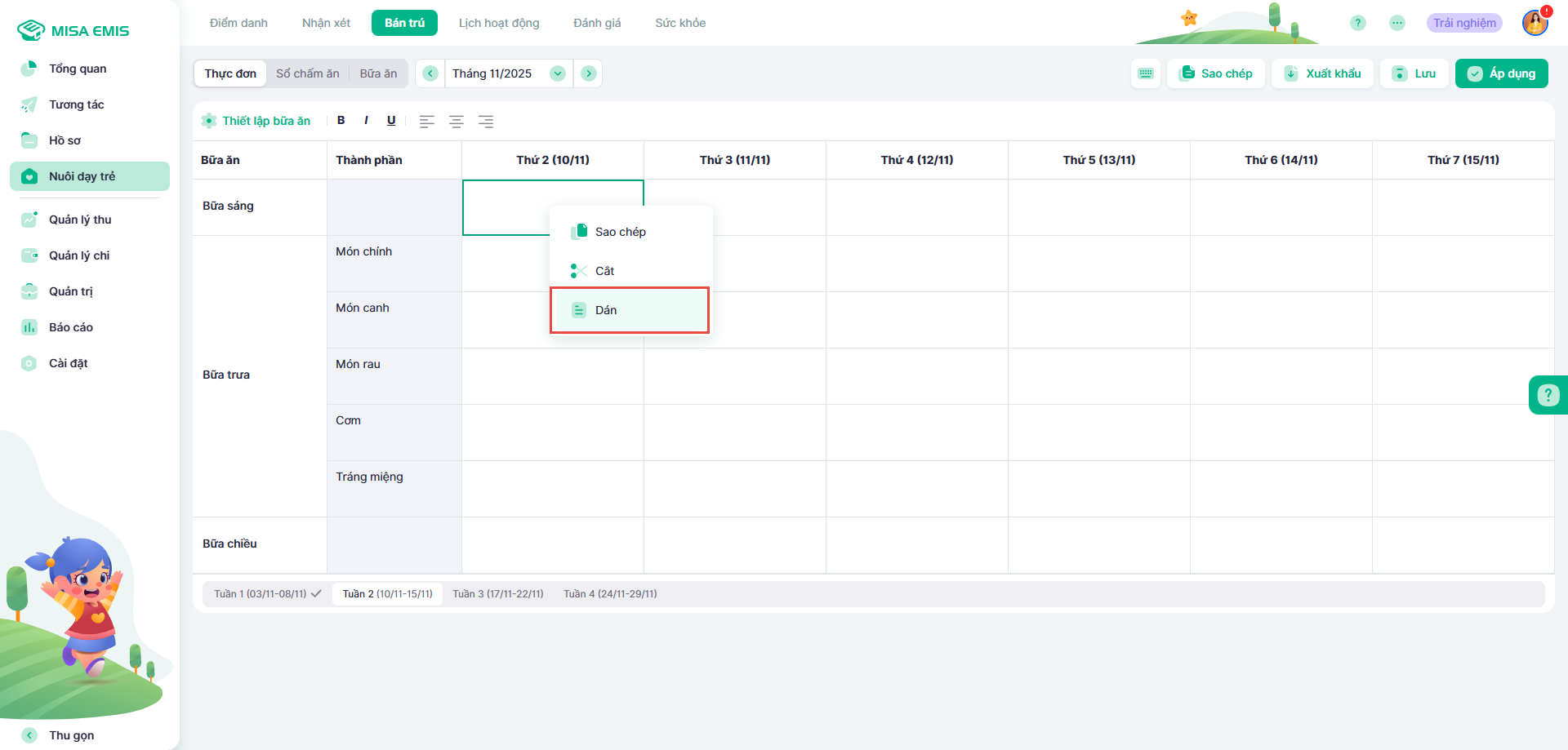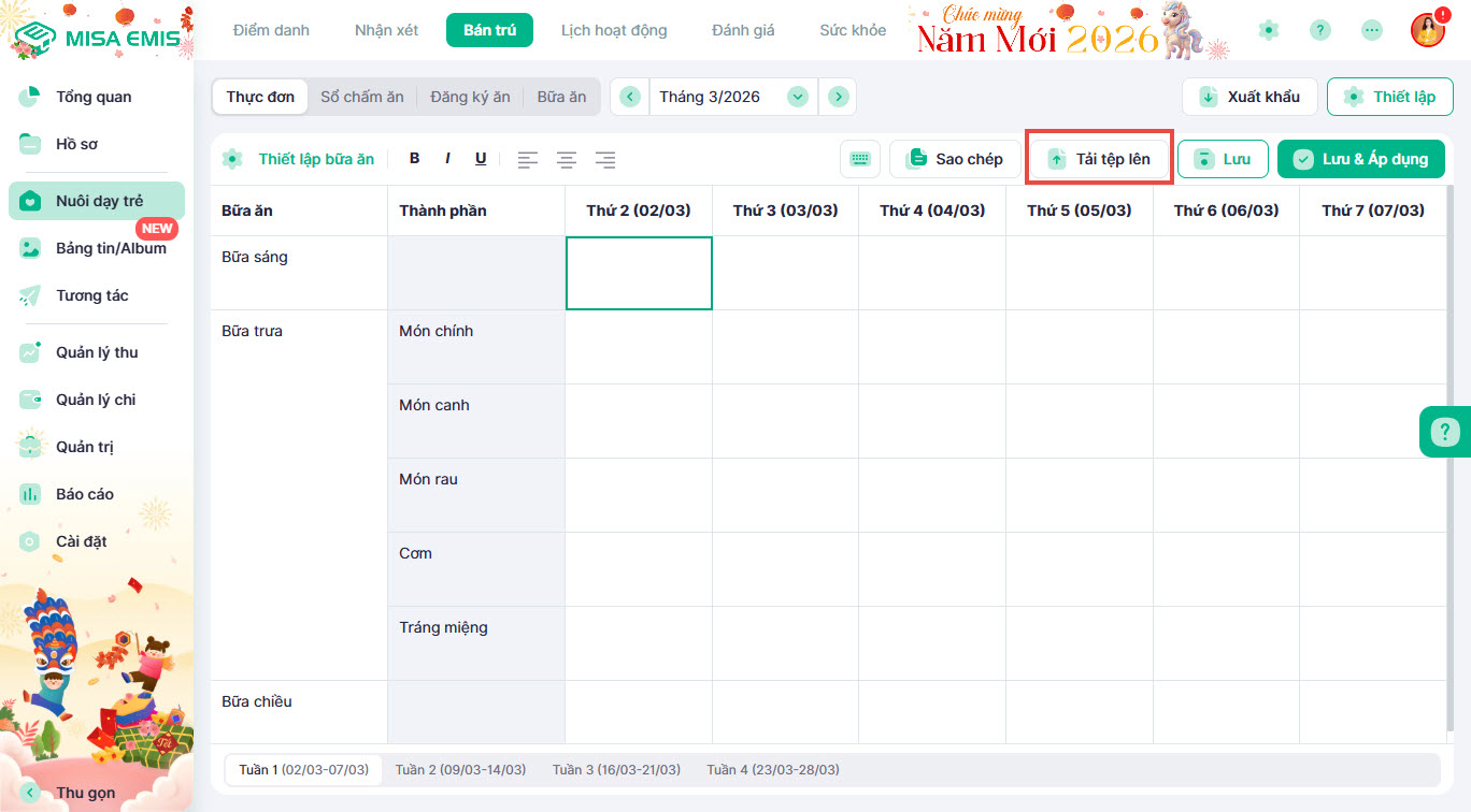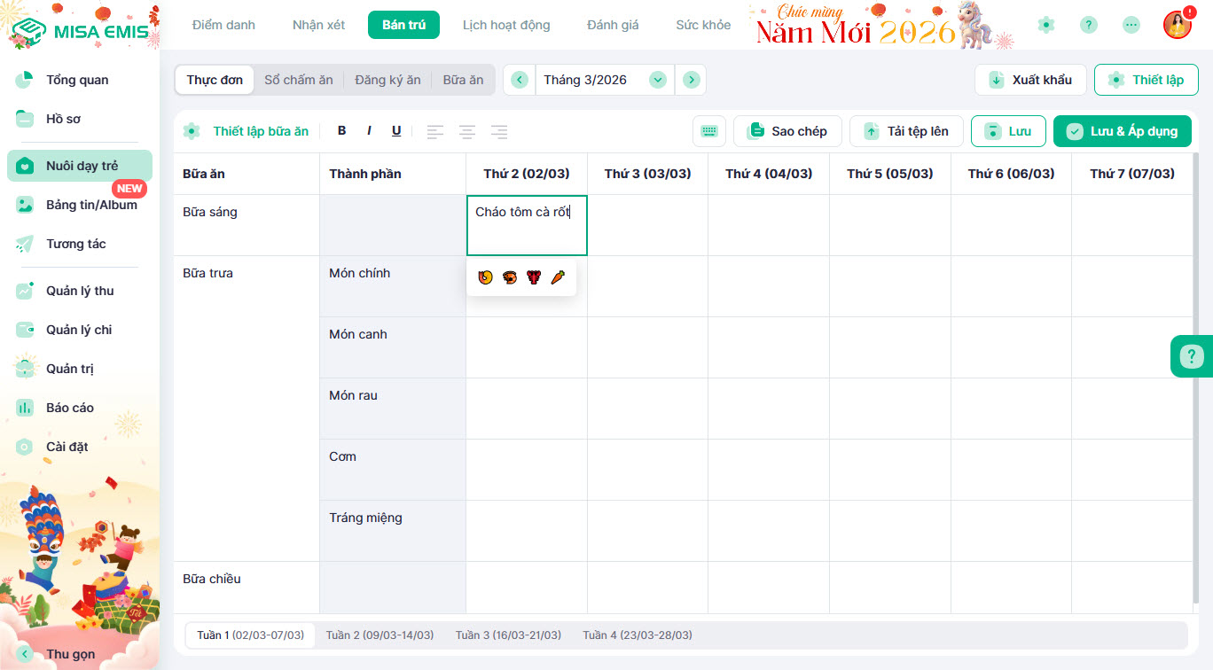 • Theo toàn trường: Tạo một thực đơn duy nhất, áp dụng cho tất cả các lớp.
