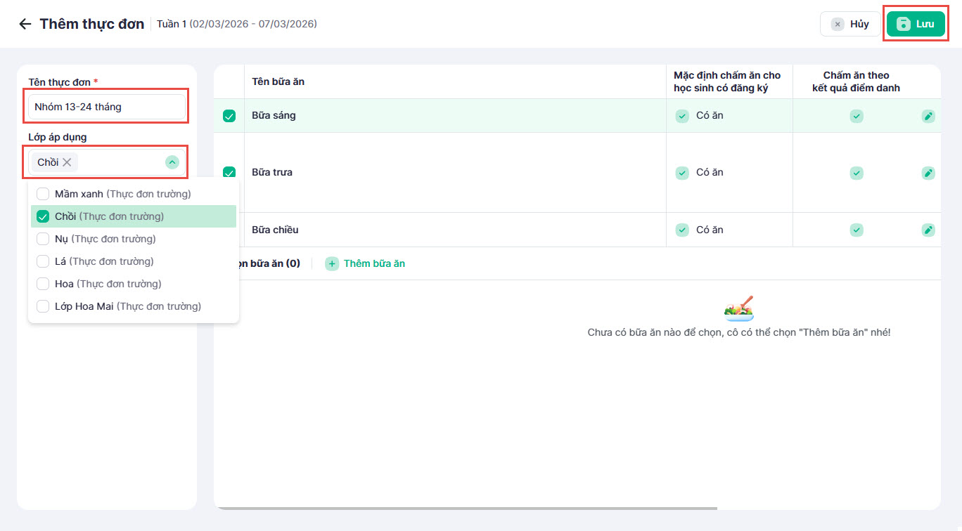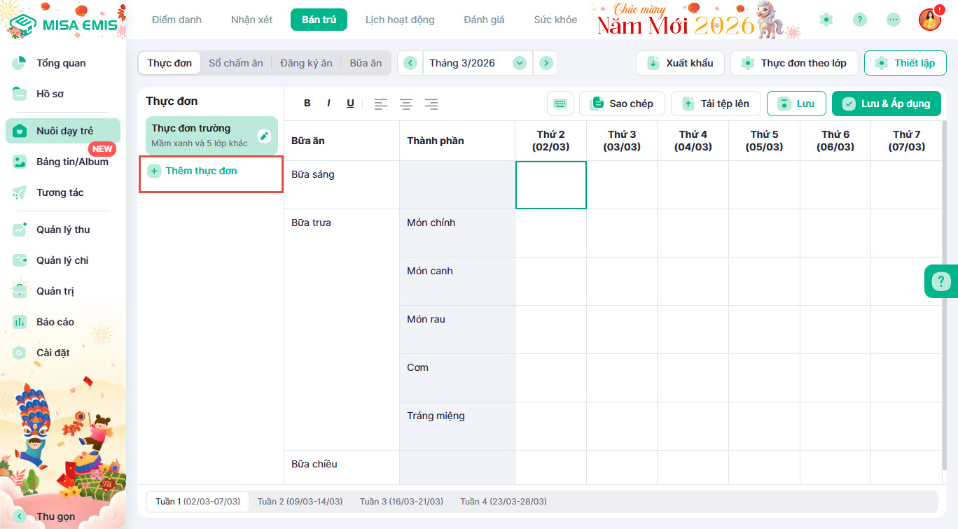 • Tại cột “Thực đơn trường”, nhấn vào + Thêm thực đơn.