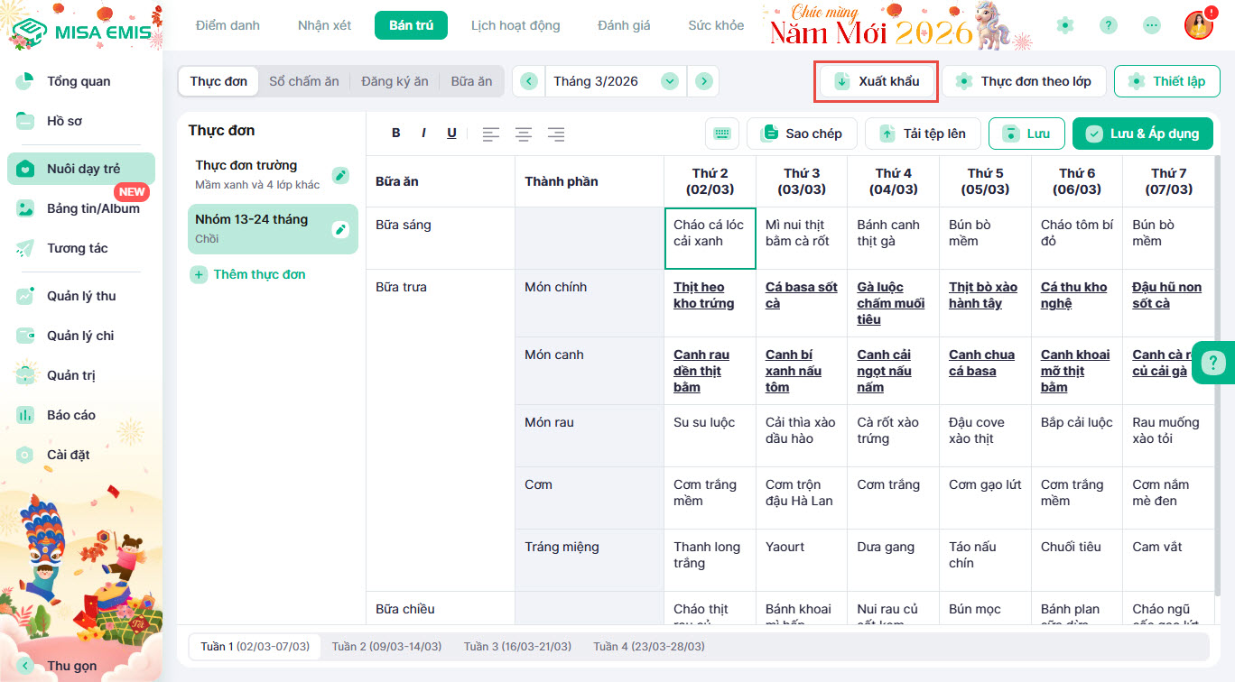 1. Tại tab Thực đơn, chọn đúng tháng hoặc tuần cần xuất.