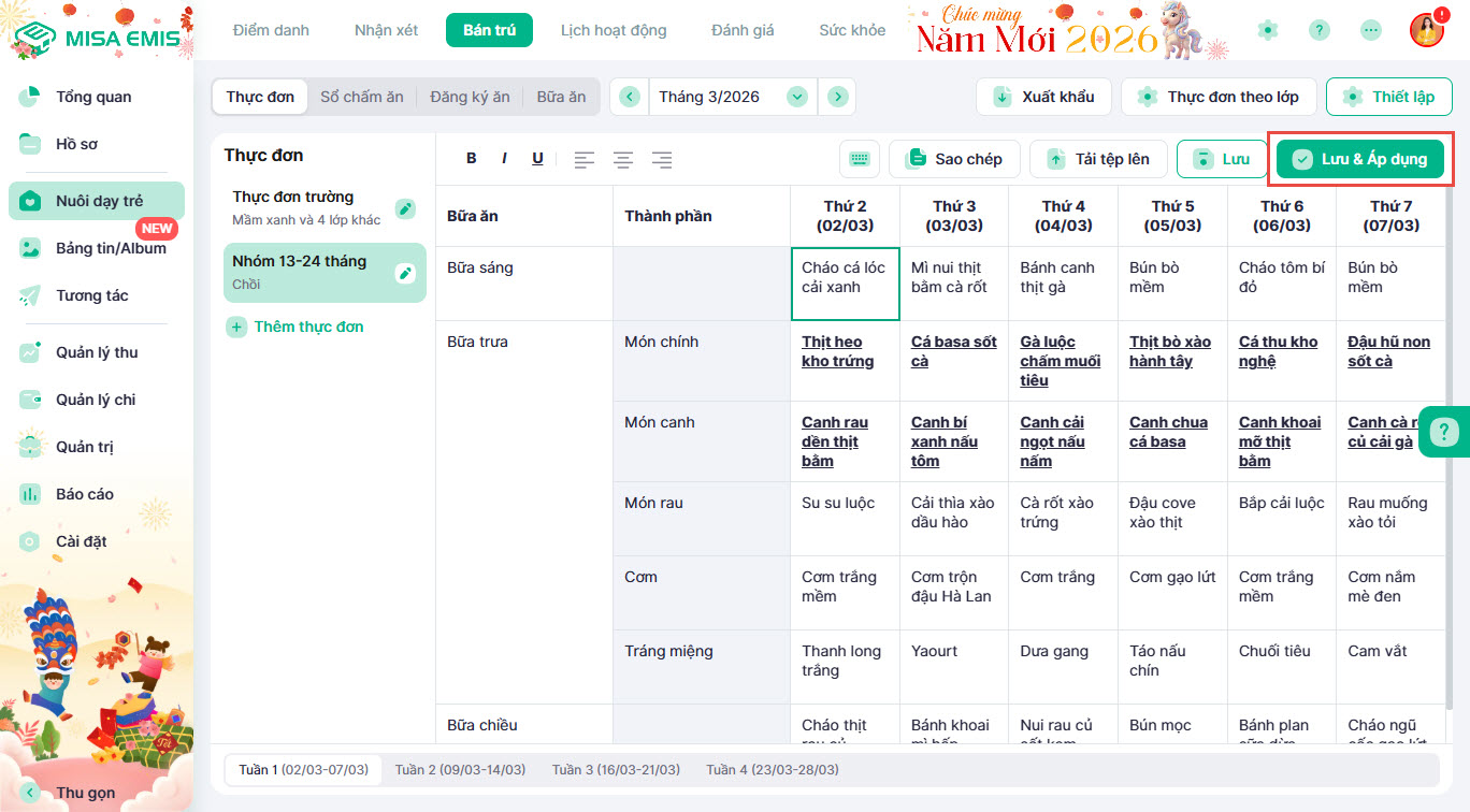 Sau khi hoàn tất việc nhập liệu và định dạng thực đơn, Anh/Chị nhấn Lưu & Áp dụng để lưu lại.