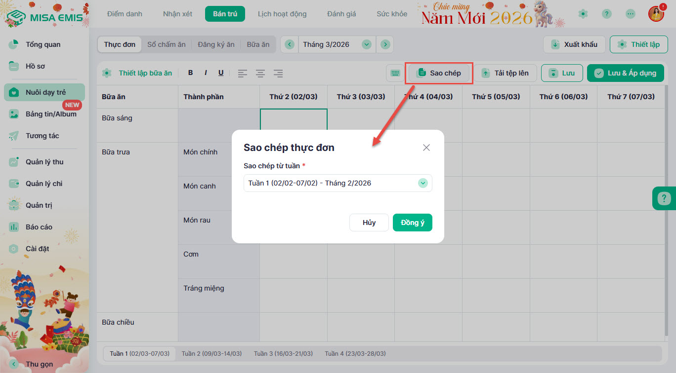 • Chọn tuần có thực đơn mà Anh/Chị muốn sao chép.