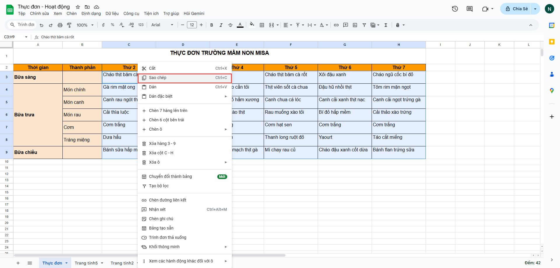 • Bôi đen và sao chép (Ctrl+C) toàn bộ vùng dữ liệu thực đơn.