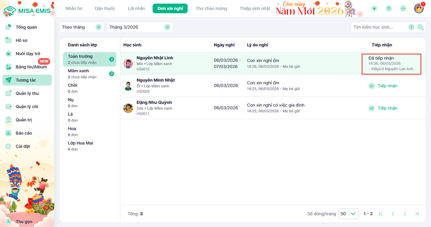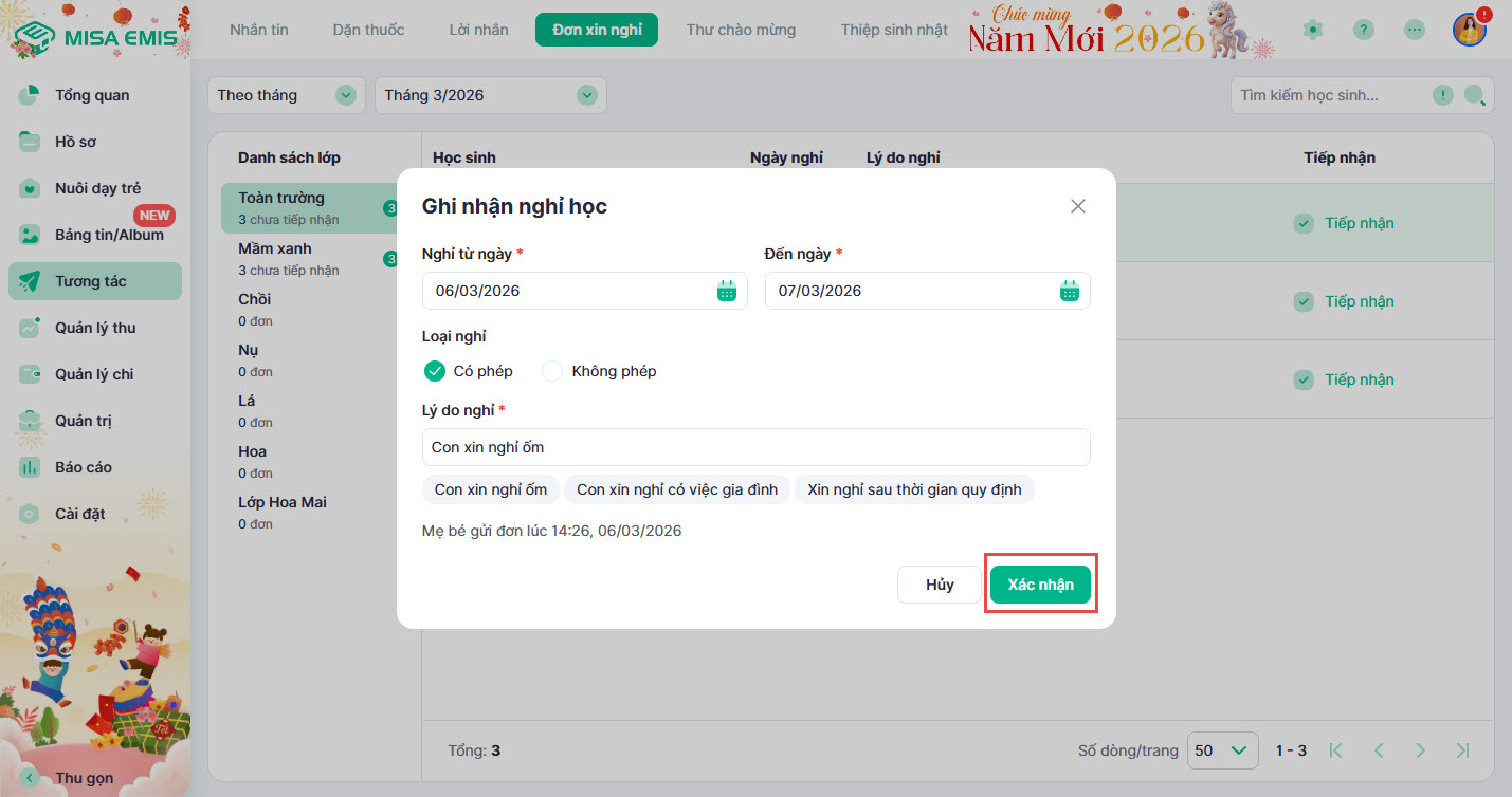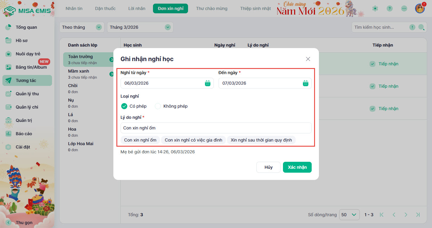 - Hướng dẫn tiếp nhận và ghi nhận chi tiết đơn xin nghỉ do phụ huynh gửi.