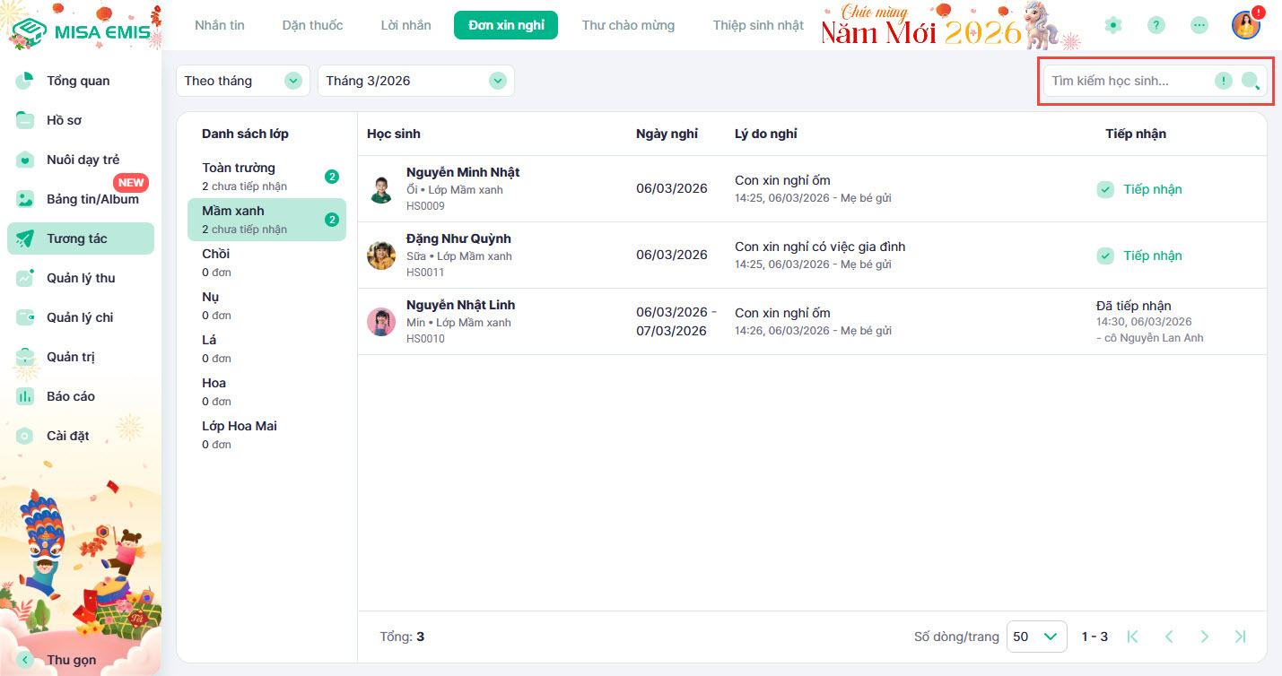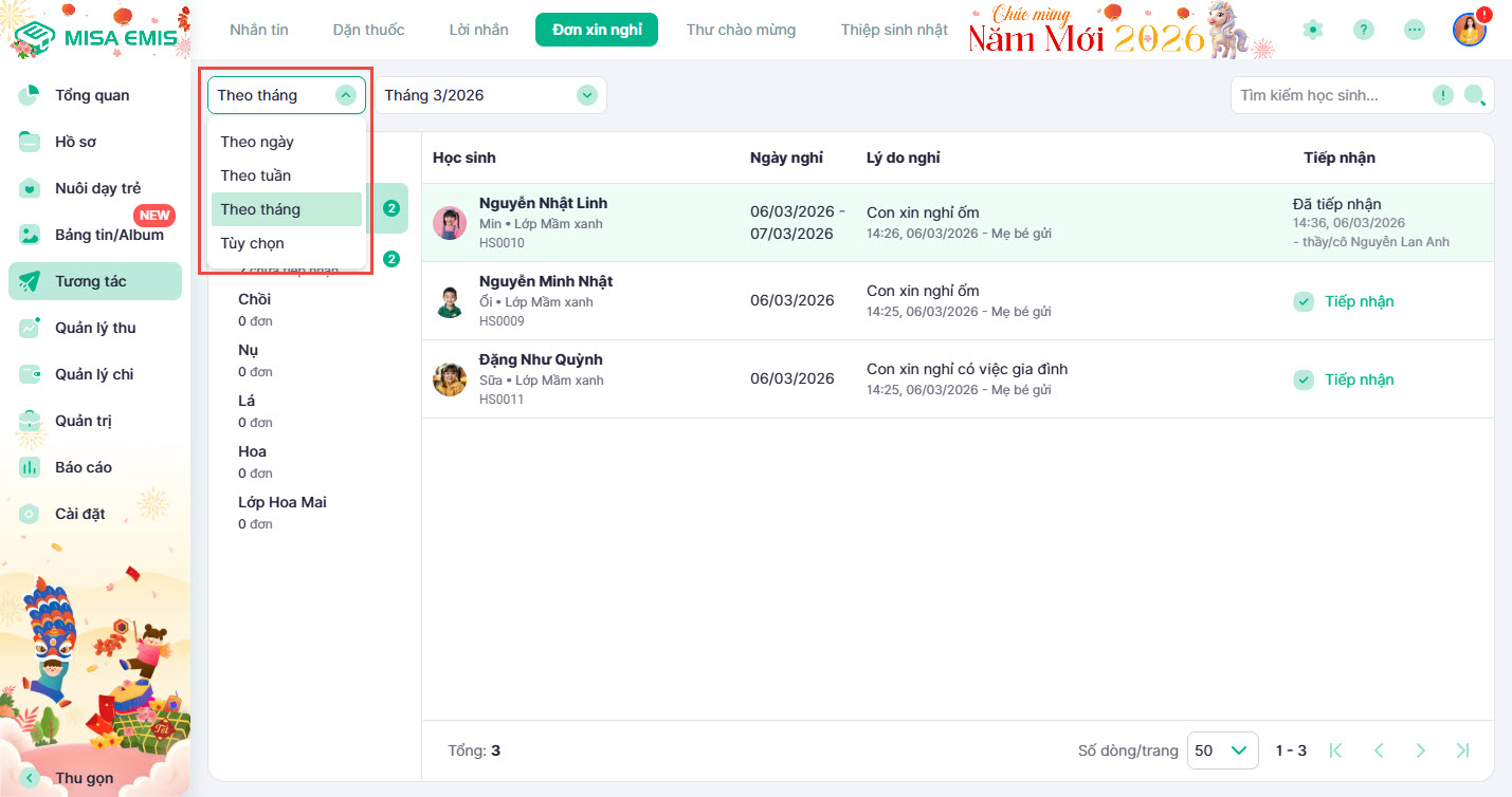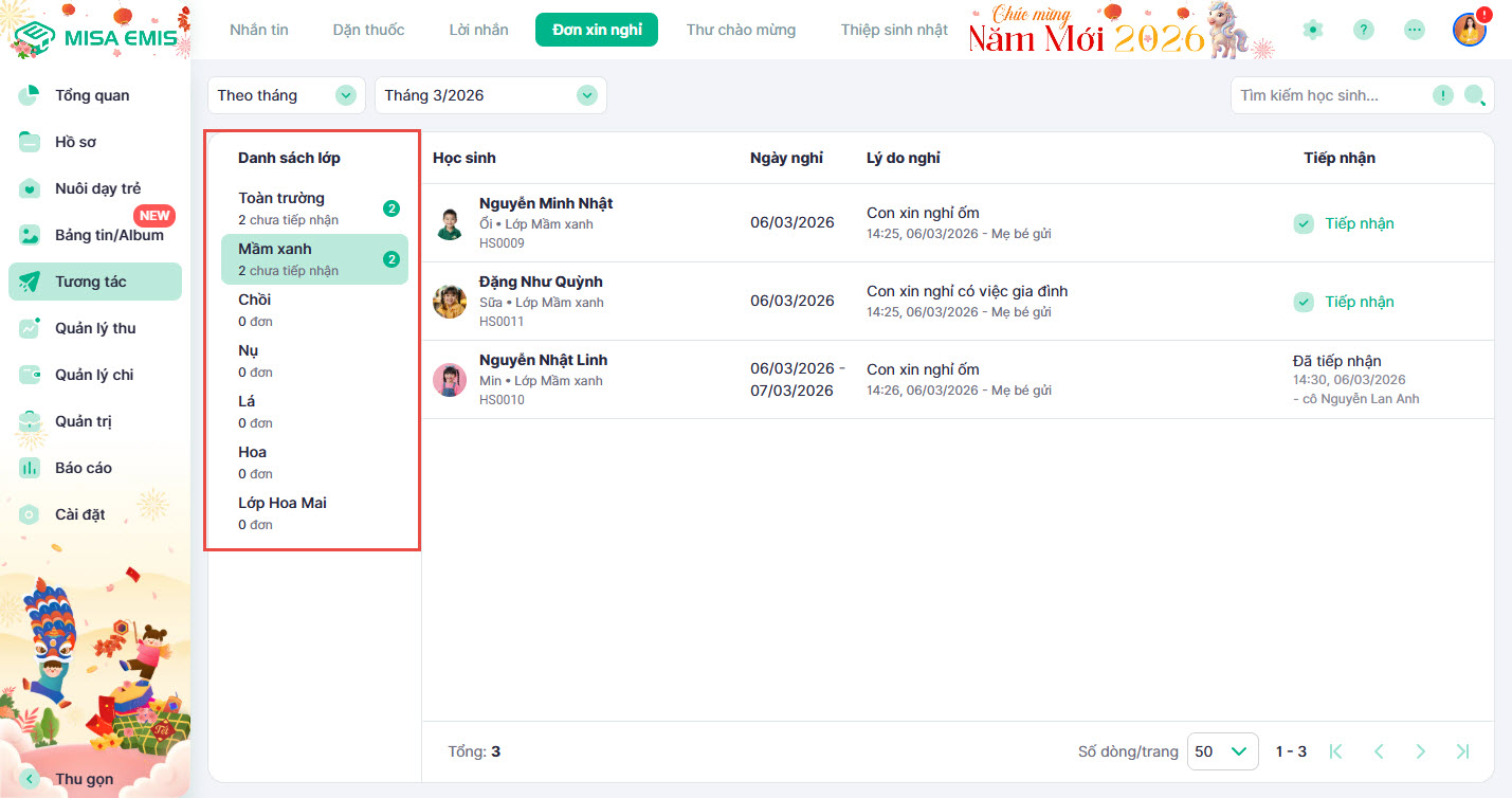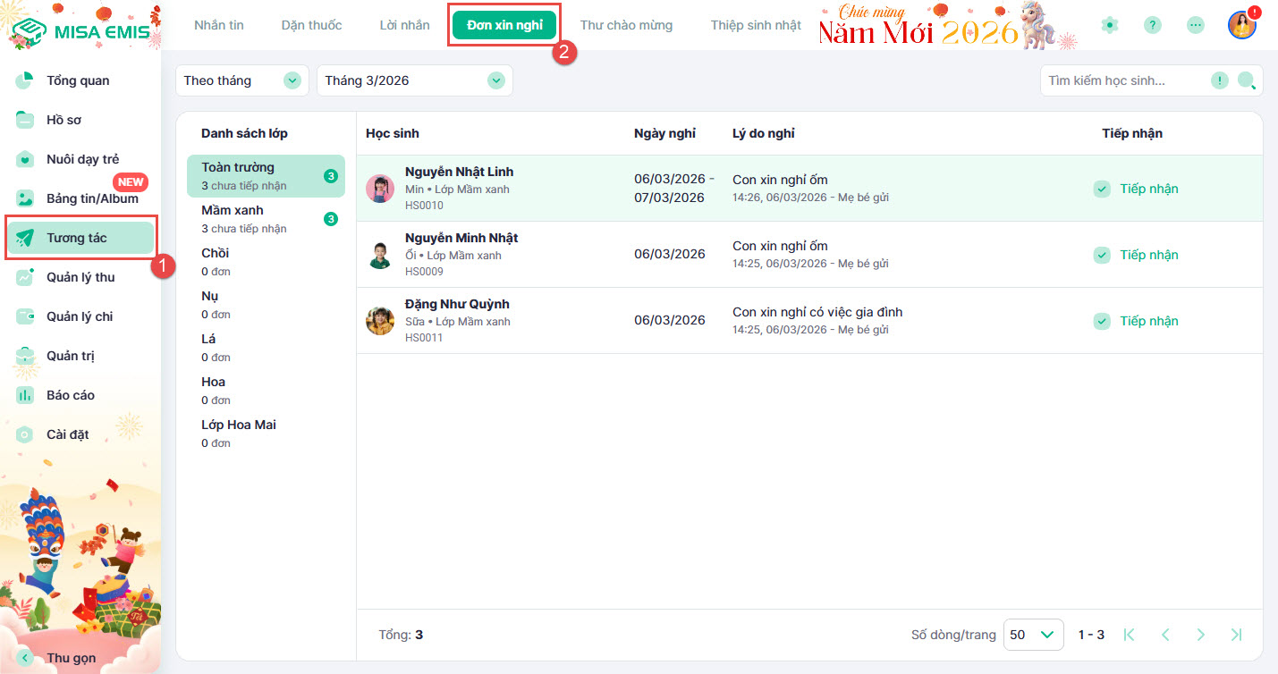 - Hướng dẫn tiếp nhận và ghi nhận chi tiết đơn xin nghỉ do phụ huynh gửi.