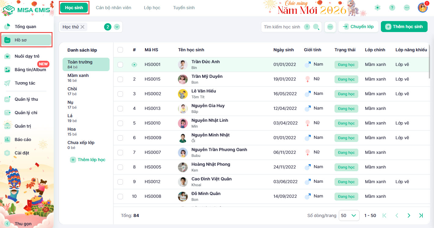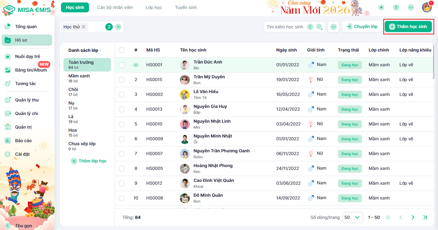 - Truy cập vào phân hệ Hồ sơ → Học sinh.