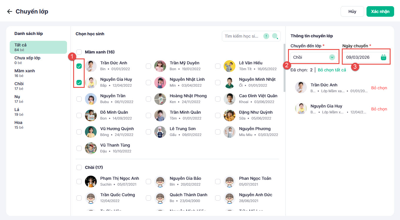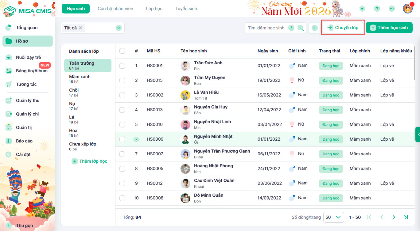 - Bước 1: Tại màn hình danh sách, nhấn vào nút Chuyển lớp.