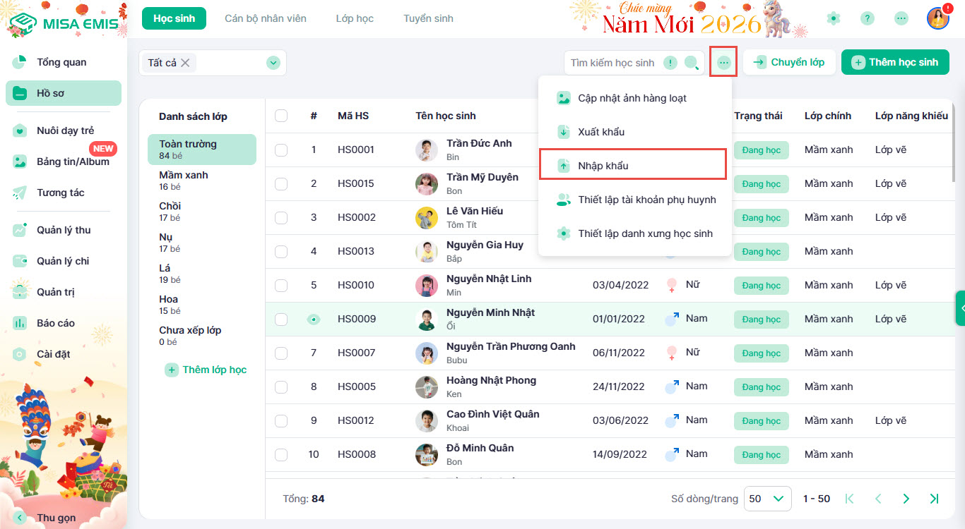 - Tại màn hình danh sách học sinh, nhấn vào biểu tượng dấu ba chấm (…) > Nhập khẩu.