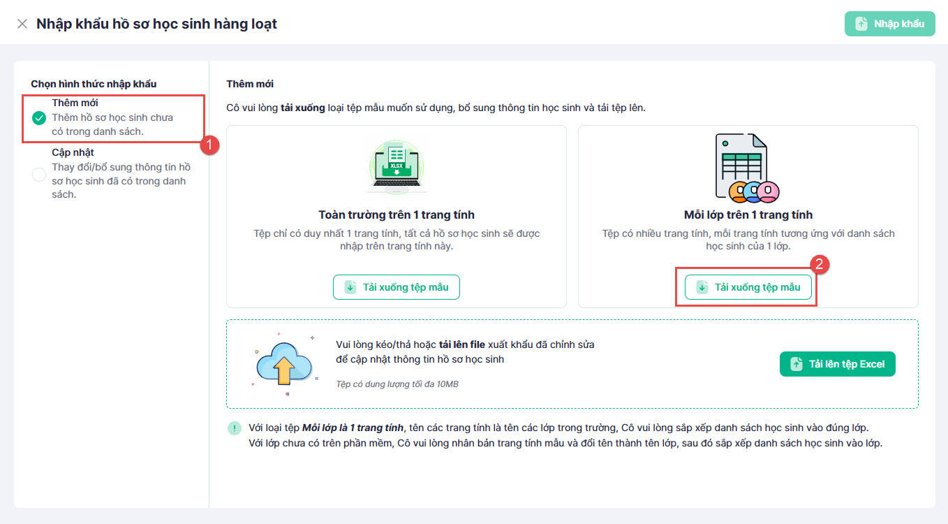 Mục đích: Giúp Anh/Chị thêm mới hoặc cập nhật thông tin cho nhiều học sinh cùng lúc thông qua file Excel, tiết kiệm thời gian và công sức nhập liệu.