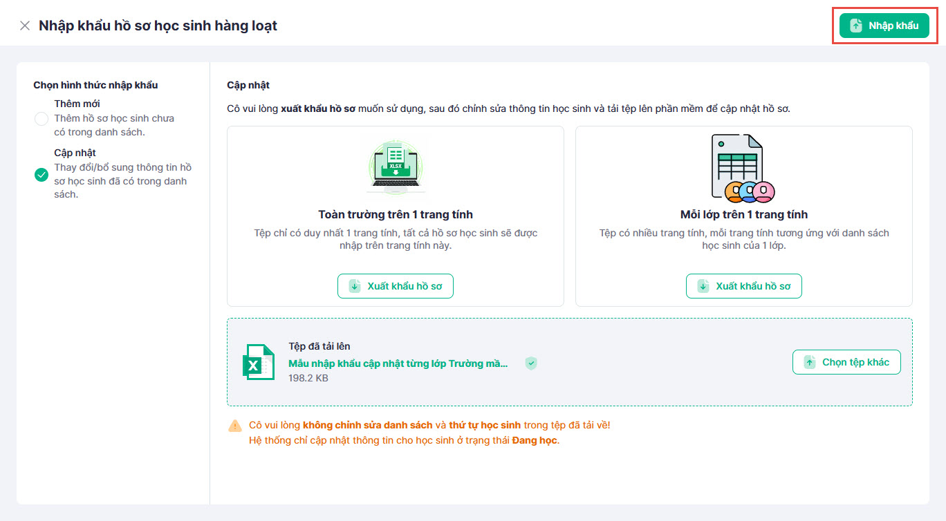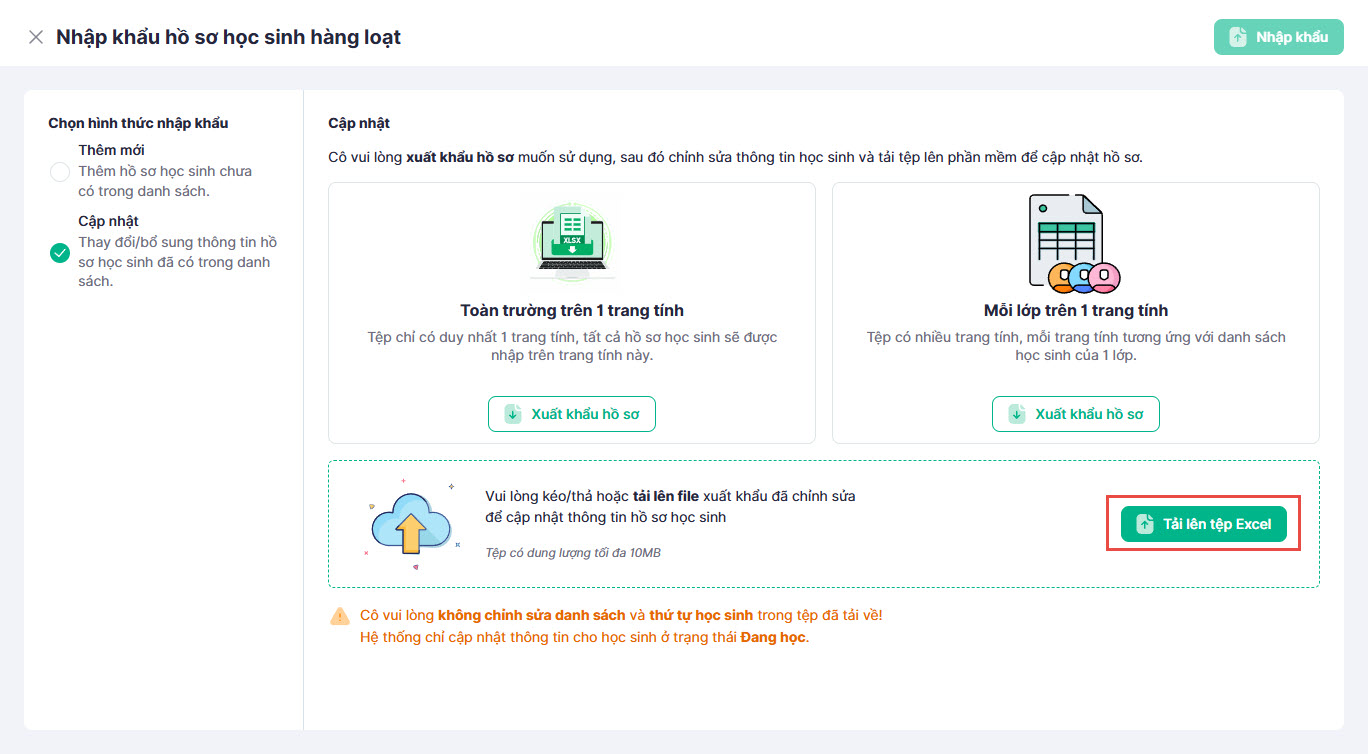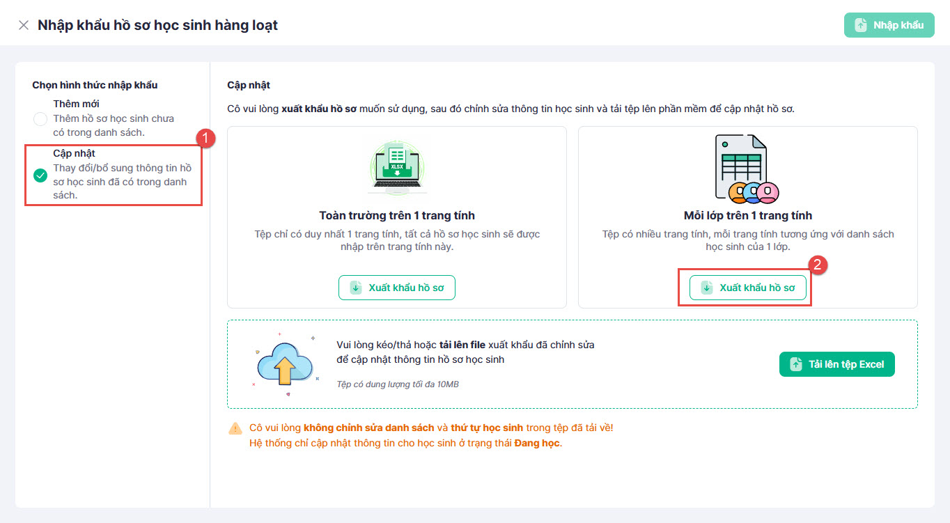 - Nhập và xuất dữ liệu hồ sơ học sinh hàng loạt từ file Excel.