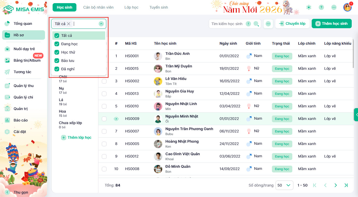 - Có thể sử dụng bộ lọc theo trạng thái để tìm kiếm học sinh nhanh hơn.