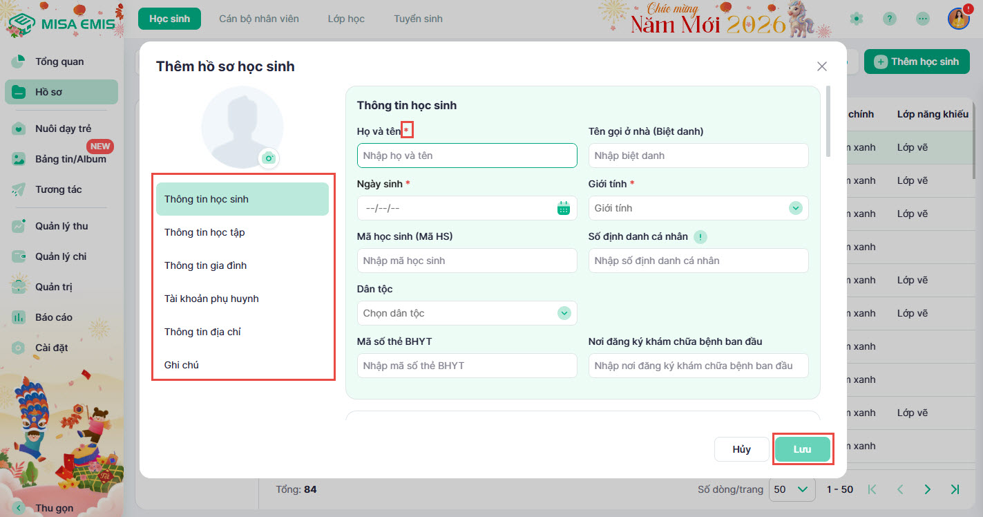 2. Thêm mới hồ sơ học sinh
