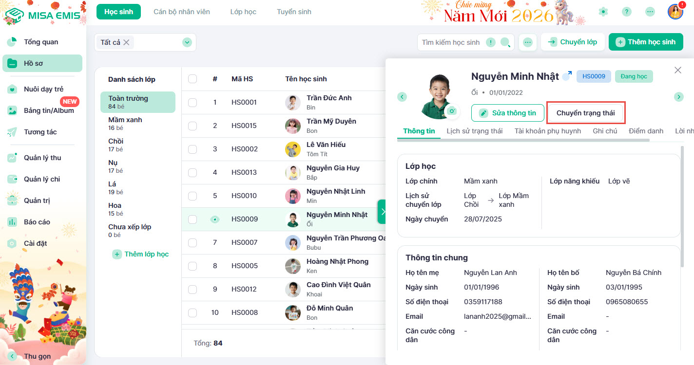 Mục tiêu: Thay đổi trạng thái học tập (đang học, nghỉ học, bảo lưu, học thử) hoặc chuyển học sinh sang một lớp khác một cách nhanh chóng.