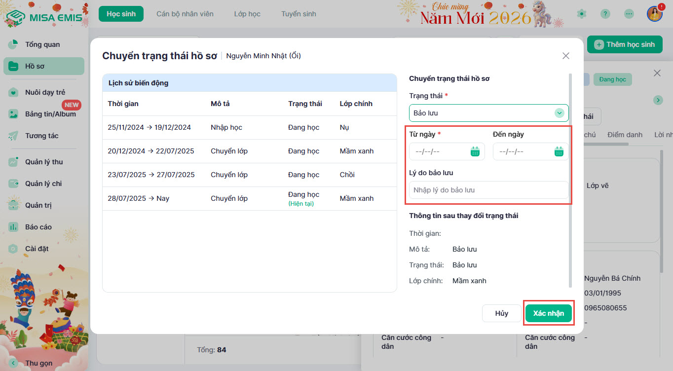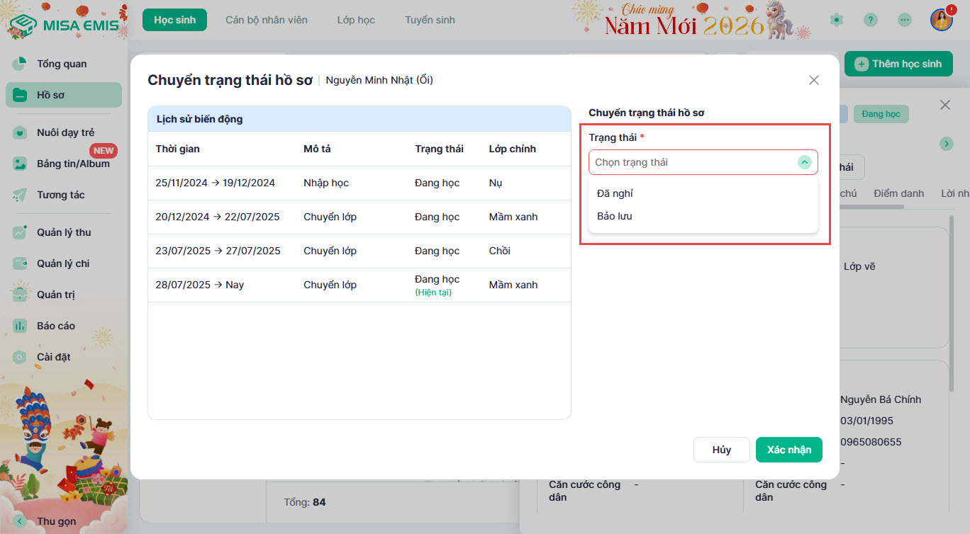 - Cập nhật các trạng thái học tập (đang học, nghỉ học, bảo lưu,…).