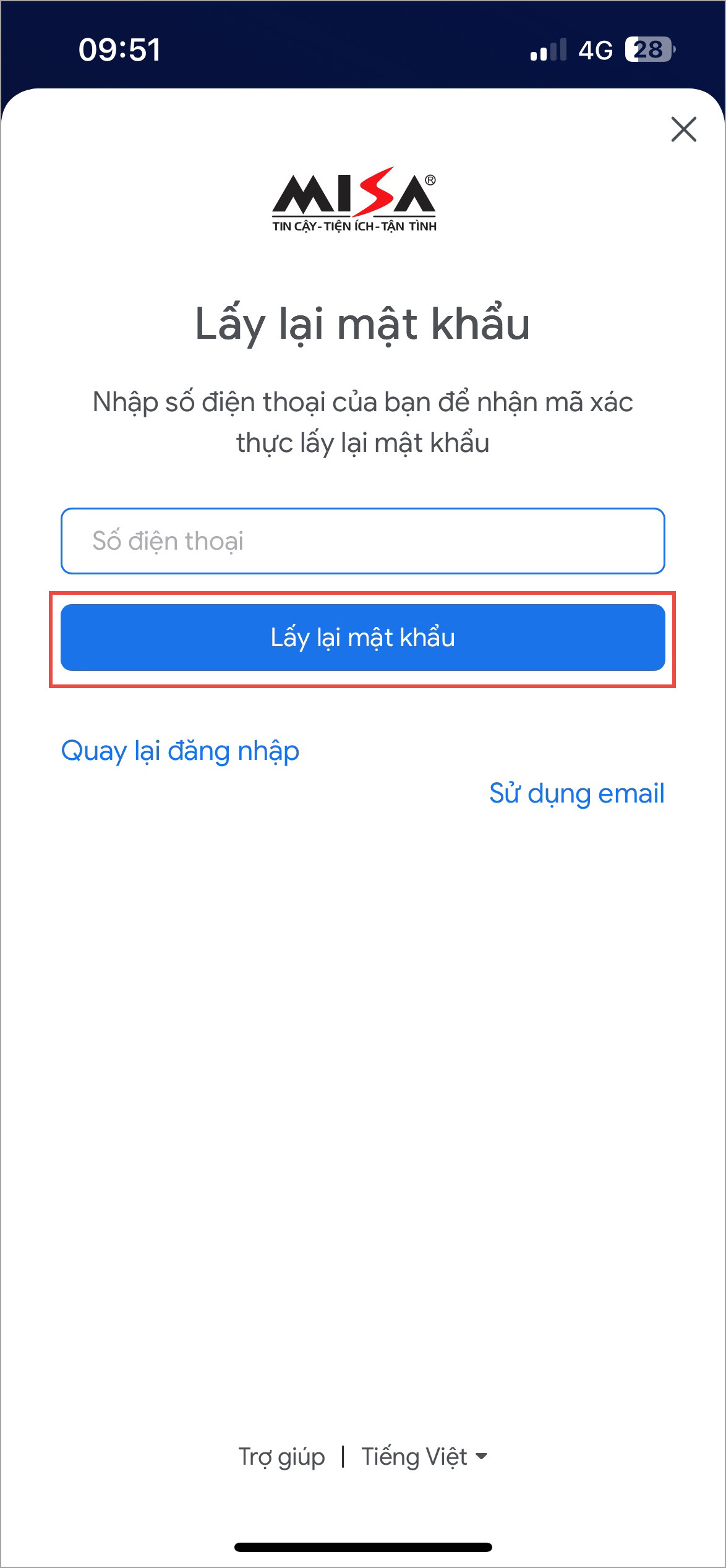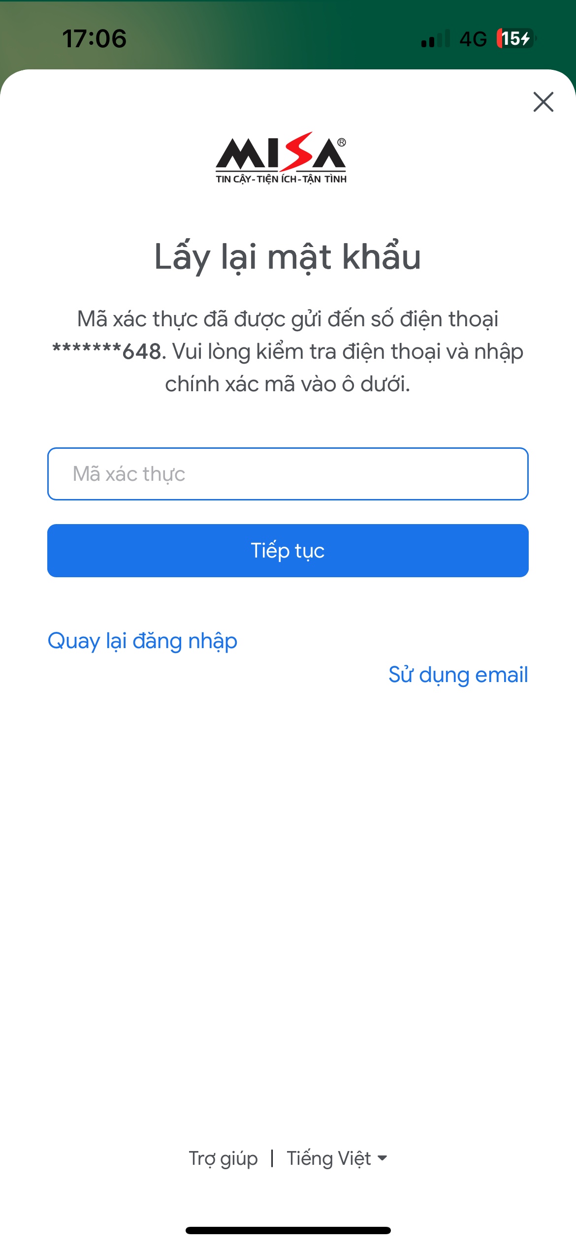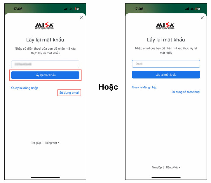 - Yêu cầu lấy lại mật khẩu thông qua số điện thoại hoặc email đã đăng ký.