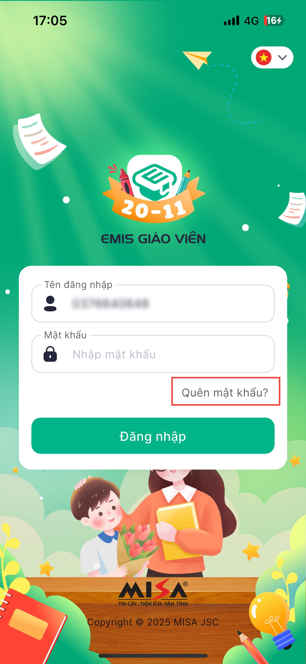 Mục tiêu: Giúp Anh/Chị đặt lại mật khẩu mới thành công để có thể đăng nhập lại vào ứng dụng EMIS Giáo viên.