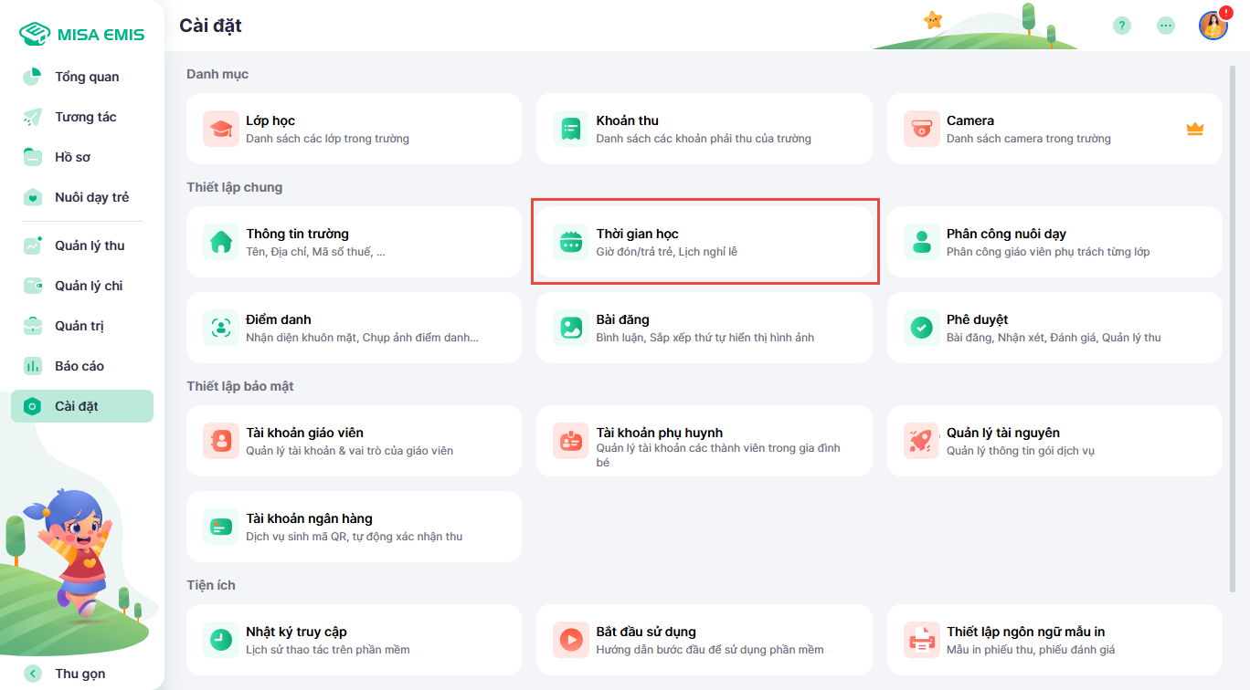 Mục tiêu: Giúp Anh/Chị cài đặt đầy đủ và chính xác các thông tin về thời gian hoạt động của nhà trường trên hệ thống.