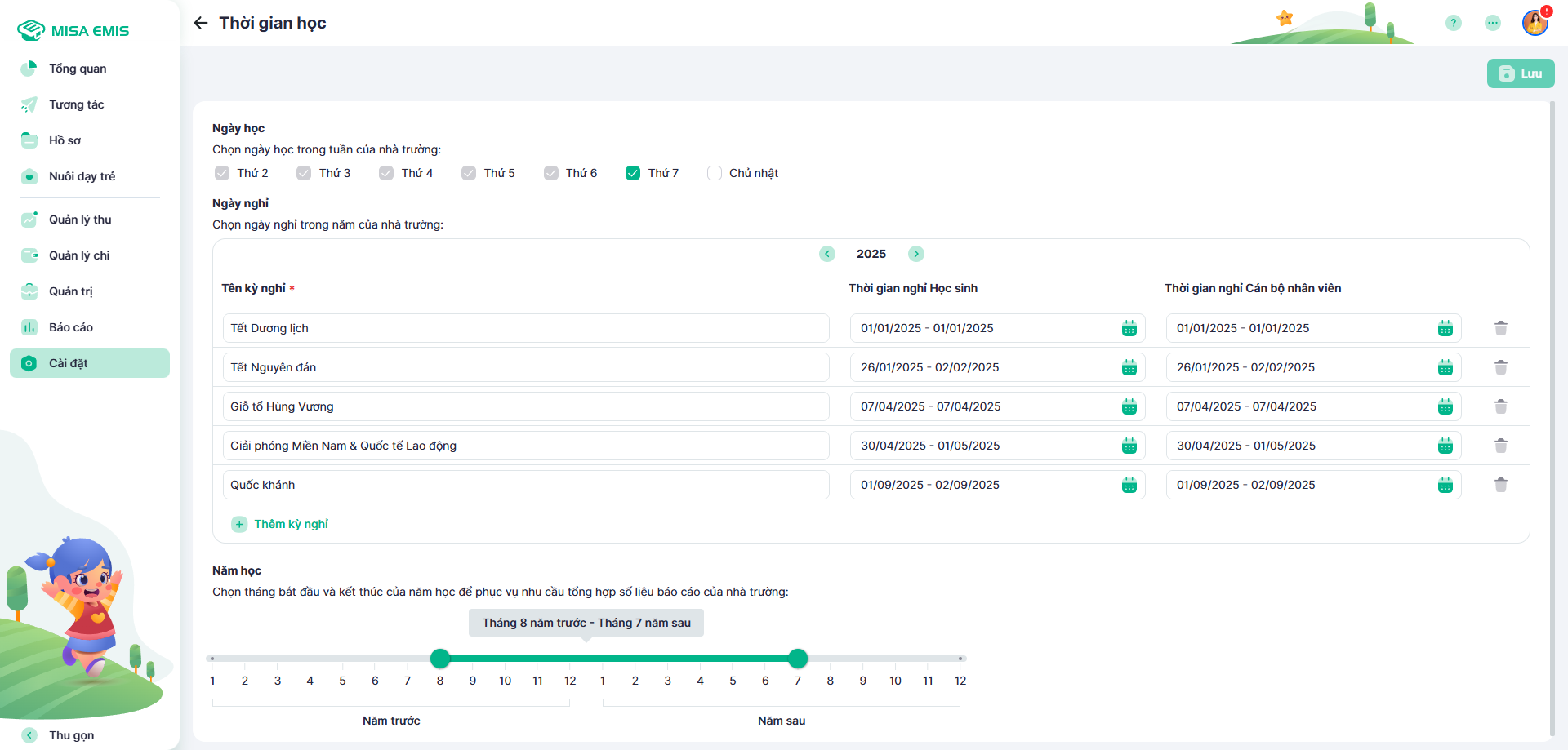 - Cài đặt thời gian bắt đầu và kết thúc của năm học.